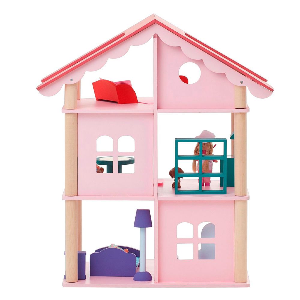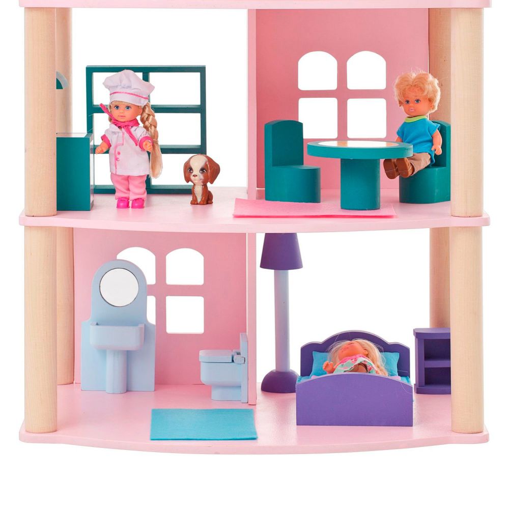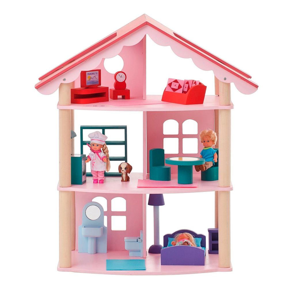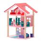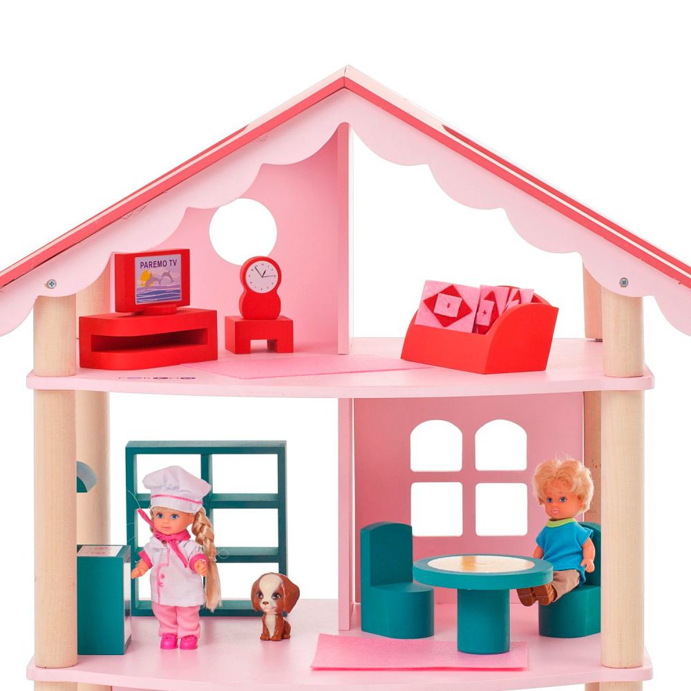Он полностью выполнен из натурального и экологически чистого материала – дерева. Благодаря этому игрушка является безопасной и соответствует высокому уровню качества. Набор состоит из самого домика, 14 предметов мебели, 5 декоративных наклеек. Домик полностью открыт, благодаря чему играть с ним очень удобно.