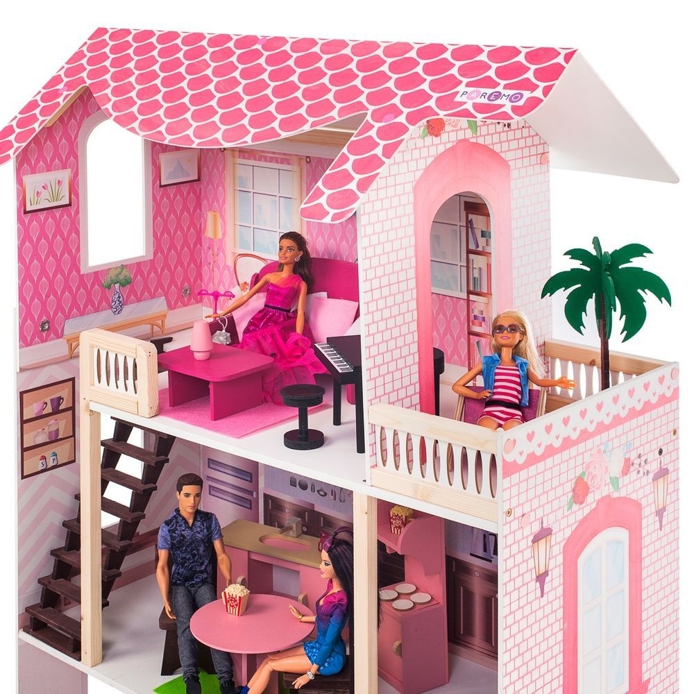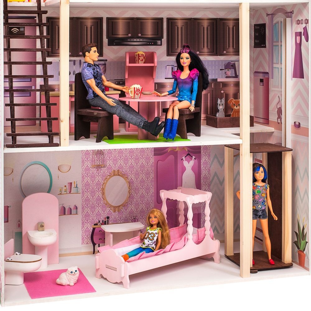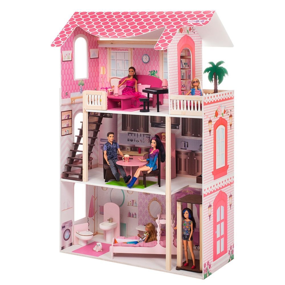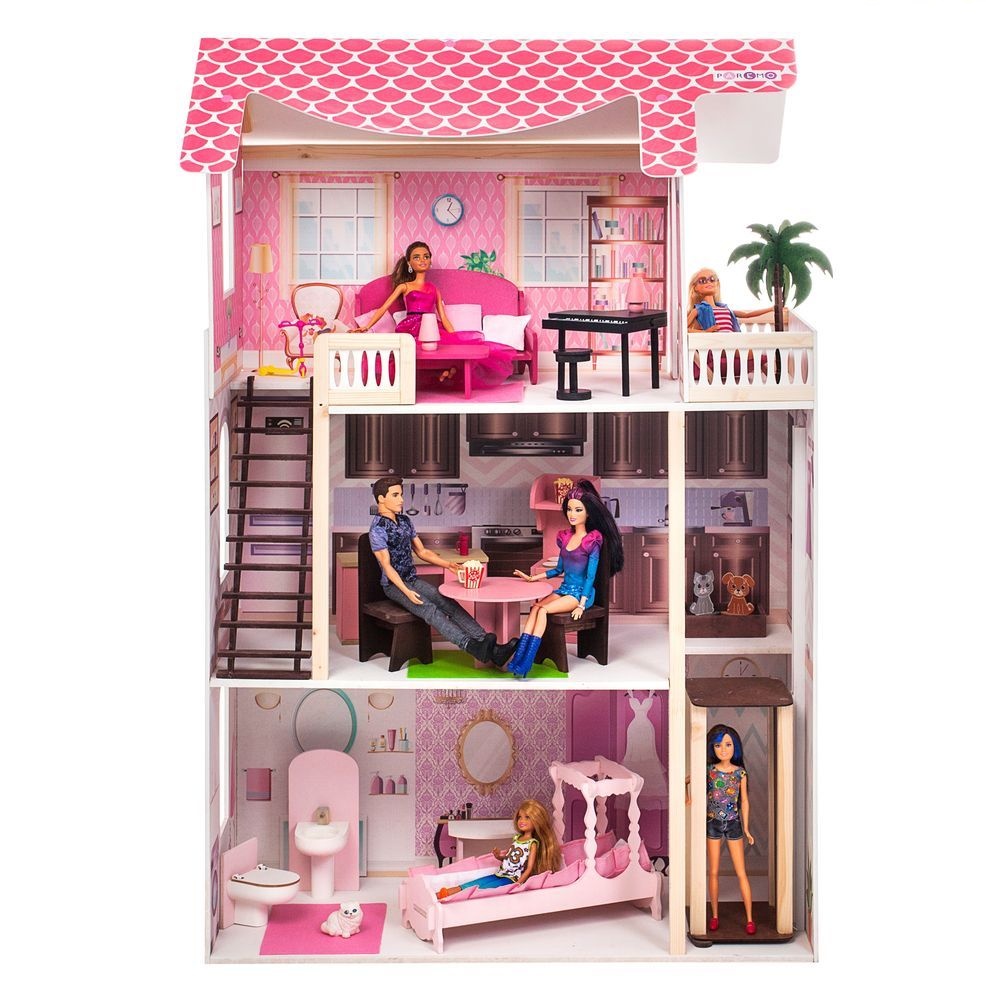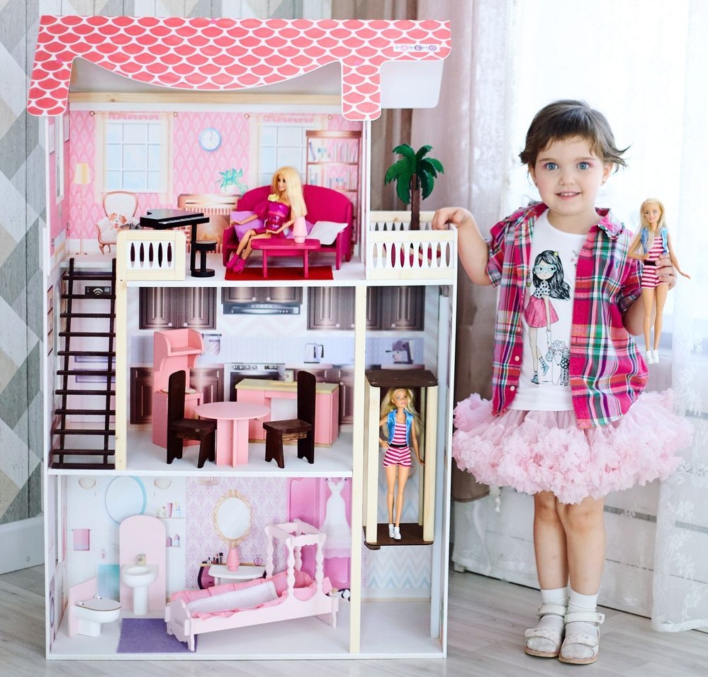 В этом домике с удовольствием поселятся любимые Барби вашей дочки или другие куклы аналогичного размера, так как высота этажей и размеры мебели как раз предназначены для этого стандарта. Множество деталей и интерактивные элементы еще больше привлекут кроху, поэтому она с удовольствием будет проводить свое время, фантазируя с этим кукольным домиком.