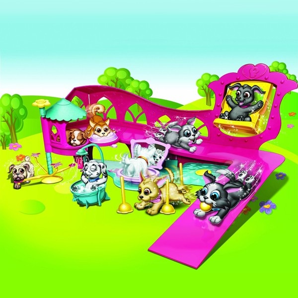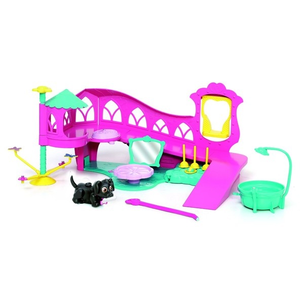Ваш щенок проведет насыщенный день, катаясь на горках и качелях, бегая за бабочками, проходя змейкой препятствия. Для игры с мячом есть специальное метательное устройство. А перед соревнованиями можно привести собачку в порядок, искупав ее в душе, расчесав и посушив перед зеркалом. После утомительного дня необходимо покормить своего питомца с помощью мисочки, расположенной на втором этаже. Щенки забавно двигают лапками при ходьбе. При желании, можно присоединить специальный поводок розового или голубого цвета к ошейнику. На спинке расположен джойстик, с помощью которого можно управлять головой, хвостиком и глазами. Щенок может взаимодействовать с аксессуарами. Например, благодаря встроенным магнитам, подбирать и следовать за своей косточкой. На ошейнике каждого щенка есть бирка в виде косточки, на которой можно написать имя своего любимца!