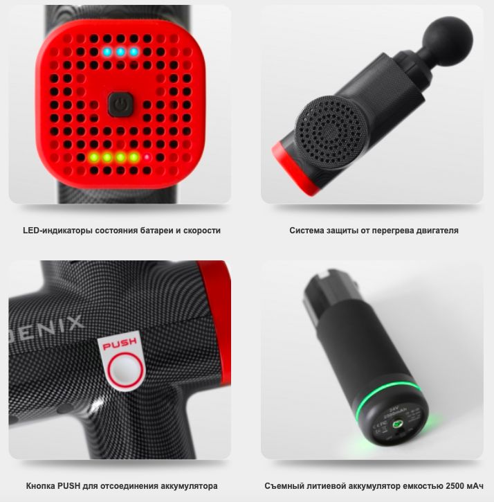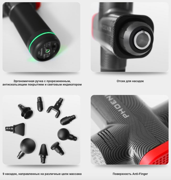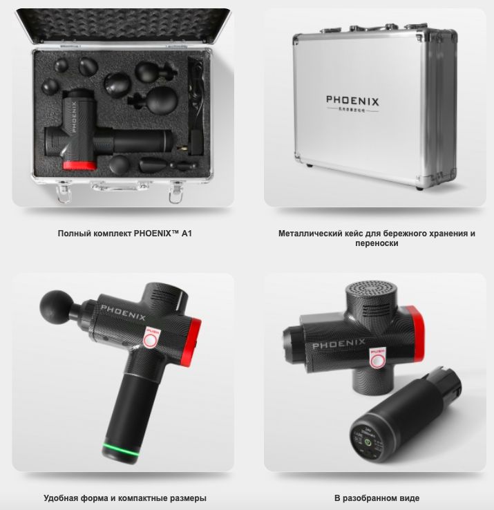 Премиальный бренд PHOENIX™, специализированный на изготовлении инновационных устройств для перкуссионного массажа, идеально подойдет для использования в домашних условиях. Более того, массажеры PHOENIX™ незаменимы в работе тренерского состава, а также применяются профессиональными спортсменами и любителями. PHOENIX™ улучшает кровообращение, снимает болезнь в мышцах, скованность и усталость после тренировок. PHOENIX™ A1 имеет компактные размеры 24*25 см (включая насадку). Эргономичная ручка с прорезиненным, антискользящим покрытием, обеспечивает отличный захват и снижает передачу вибраций. У пистолета-массажера 3 уровня скорости- низкая (1800 уд/мин), средняя (2400 уд/мин) и высокая (3200 уд/мин). Для начинающих пользователей рекомендуется использовать самую низкую скорость. PHOENIX™ A1 относится к классу бесшумных массажеров. Двигатель устроен таким образом, что выдает от 40 до 60 дБ звука на самой высокой скорости, что эквивалентно громкости спокойного разговора в помещении. Высококачественная литиевая батарея работает от 3 до 5 часов в зависимости от режима при полной зарядке. Емкость батареи составляет 2500 мАч. На PHOENIX™ A1 установлен съемный аккумулятор, который легко отсоединяется при помощи кнопки PUSH на устройстве. Для простоты использования и регулировки на массажере PHOENIX™ A1 расположены LED-индикаторы, позволяющие определить уровень скорости, а также состояние и работоспособность аккумулятора. На ручке установлен индикатор с зеленой подсветкой. В комплект тренажера входит сразу 9 насадок, направленных на различные цели. Среди них «шар» – для различных групп мышц, «плоскость» - для всего тела, «пуля» - для точечного использования и «вилка» - для позвоночника. Для хранения массажера и всех его комплектующих предусмотрен металлический кейс, который не только подчеркивает премиальность продукта, но и поможет бережно его хранить и складывать после каждого применения. Перед использованием проконсультируйтесь со специалистом. Прежде чем приступить к работе с массажером, внимательно изучите инструкцию.