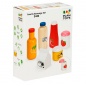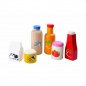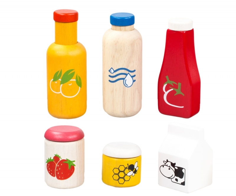 Необычный игровой набор от производителя Plan Toys включает в себя шесть деревянных баночек, бутылочек и пакет, предназначенных для хранения еды и напитков - кетчуп, мед, апельсиновый сок, клубничный джем, вода и молоко. Все элементы имеют аккуратно закругленные края для большей безопасности ребенка во время игр. Данный набор прекрасно подойдет для любимых игр всех девочек на темы чаепития, шопинга и "дочки-матери".