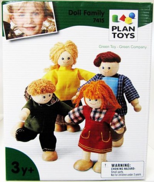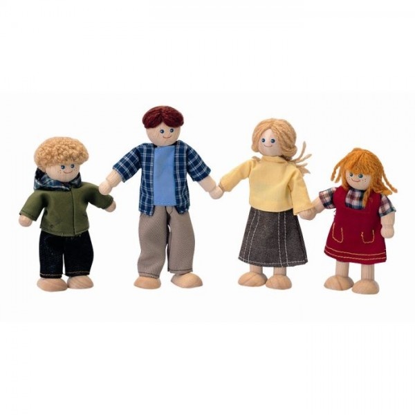 Кукольная семья от Plan Toys состоит из папы, мамы и двоих детей (мальчика и девочки). У всех кукол, одетых в повседневную одежду для прогулок в городе, голова и туловище сделаны из прочной древесины. Руки и ноги выполнены из проволоки и могут принимать разную форму. Куклы могут сидеть и стоять. Одежда сделана из натурального хлопка с использованием нетоксичных красок.