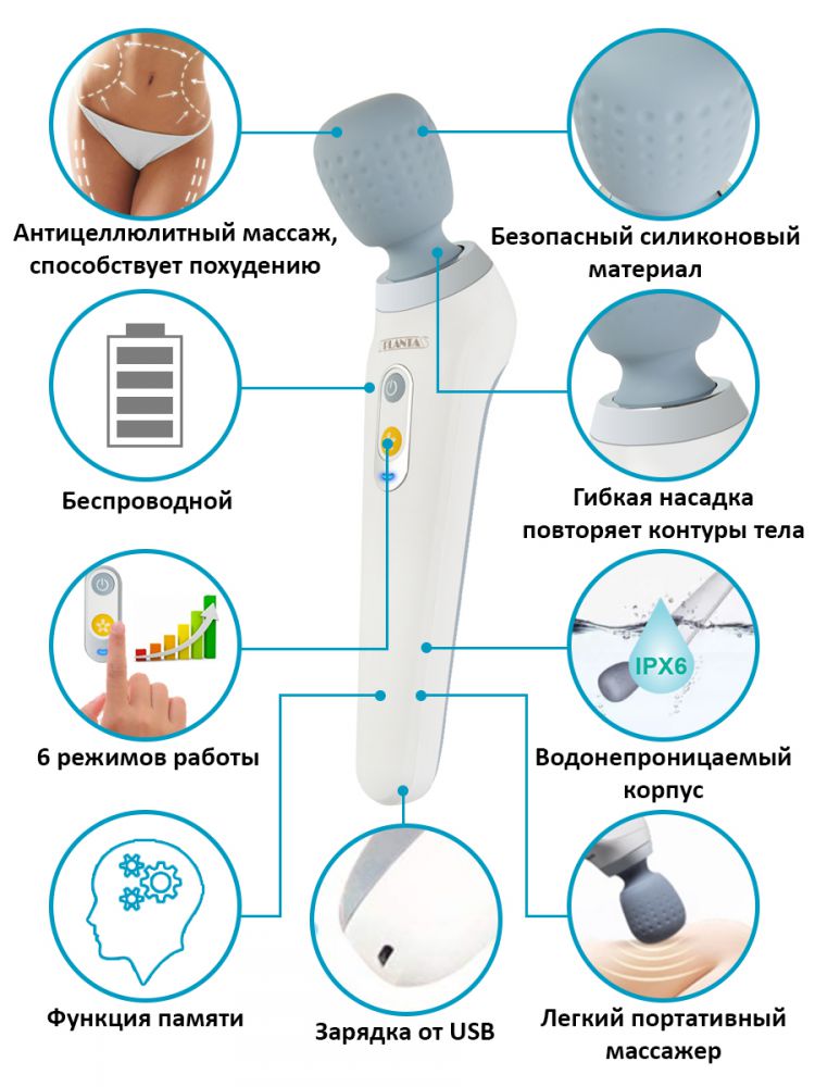 Многофункциональный портативный ручной вибромассажер для тела Planta MHH-40 Fitness Wand оказывает разогревающее действие, улучшает кровообращение и ускоряет обменные процессы в мышечных тканях и коже, восстанавливает их эластичность, укрепляет стенки сосудов.