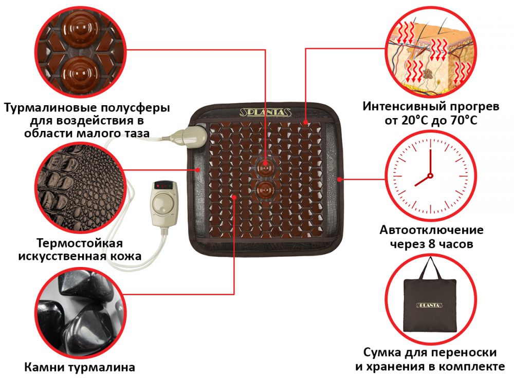 Турмалиновый тепловой мат Planta PL-CANVAS1 предназначен для прогревания тела. 102 гексагональных медальона из натурального турмалина и 2 турмалиновых полусферы, соприкасаясь с кожей тела, имитируют нажатие пальцев, как при точечном массаже, одновременно прогревая ткани организма. Это значительно улучшает кровообращение, т.к. к прогреваемым точкам активно поступает обогащенная кислородом кровь. Керамические медальоны из турмалина изготовлены в виде шестигранника, наиболее эргономичной геометрической формы, что способствует наиболее равномерному прогреванию всего организма.