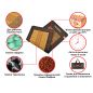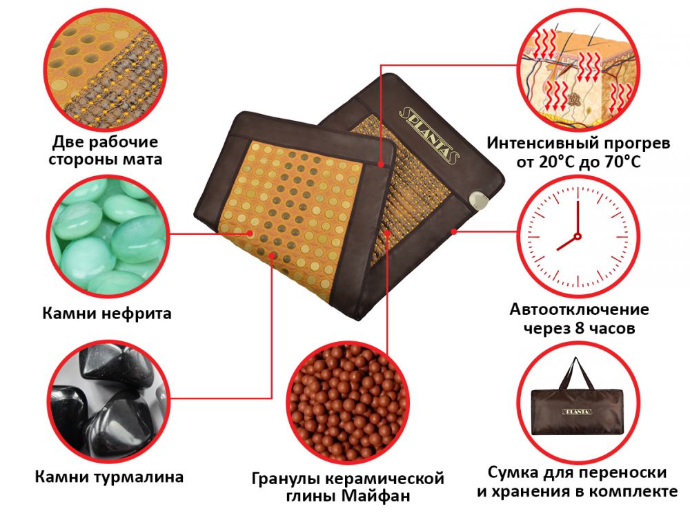 В целях безопасности мат оснащен двумя тепловыми сенсорными предохранителями и функцией автоотключения через 8 часов. Нихромовый кабель, который нагревает мат, равномерно уложен по поверхности, поэтому все 216 керамических пластин прогреваются до одинаковой температуры. Фольга в нижней части мата помогает греть только тело, а не пол или диван. При нагревании кристаллы турмалина и нефрита создают инфракрасное тепло, которое проникает в тело человека на 10-15 см, что улучшает кровоток и микроциркуляцию, расширяя кровеносные сосуды и расслабляя мышцы в области нагрева. Положительный эффект от использования мата проявляется в улучшении сна, устранении усталости, повышении подвижности суставов, нормализации работы всего организма, а также уменьшении подкожно-жирового слоя.