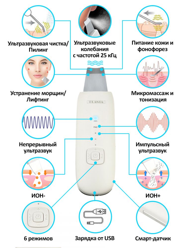 Прибор аппаратной косметологии для домашнего применения, позволяющий осуществлять комплексные процедуры по уходу за кожей. Принцип действия прибора основан на генерации ультразвукового сигнала с частотой 25 кГц, вызывающего колебания тонкой металлической лопаточки из гипоаллергенного металла, а также воздействия гальванических микротоков, позволяющих проработать всю зону лица, включая деликатные области вокруг глаз, носа и губ. Прибор имеет 6 режимов: непрерывный ультразвук - ультразвуковая чистка/пилинг; непрерывный ультразвук и положительно заряженные ионы - глубокая чистка пор/скраббинг; непрерывный ультразвук и отрицательно заряженные ионы – питание кожи/фонофорез; импульсный ультразвук - микромассаж/тонизация/лимфодренаж; импульсный ультразвук в и положительно заряженные ионы - подтяжка кожи лица/лифтинг; импульсный ультразвук и отрицательно заряженные ионы - питание и увлажнение/тонизация.