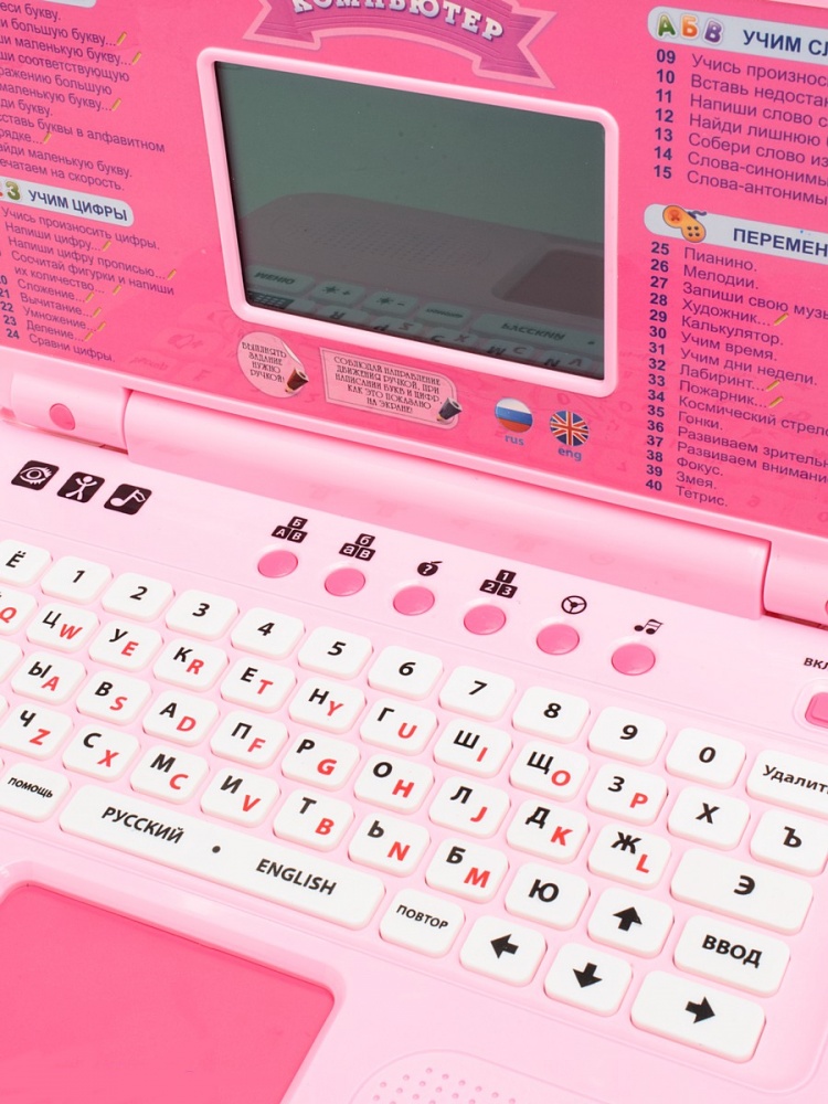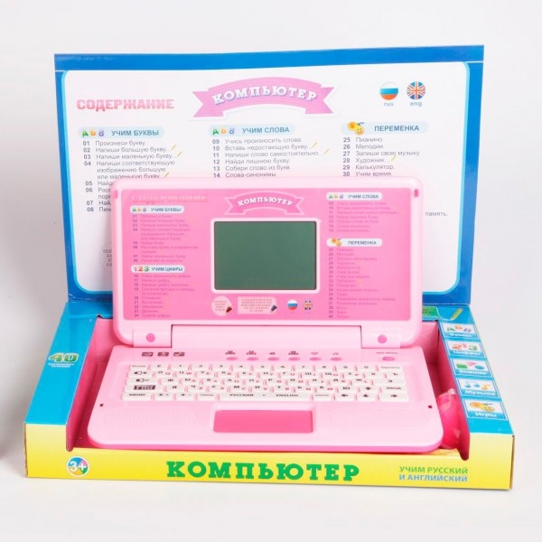 Ноутбук оснащен 40 функциями, которые позволят ребенку выучить алфавит и цифры. Все уроки представлены в игровой форме. Игрушка поддерживает как русский, так и английский язык. Между занятиями ребенок может играть в игры, а также выполнять познавательные задания в разделе «Перемена», например, учить время или дни недели. Звуковые эффекты сделают использование интереснее.