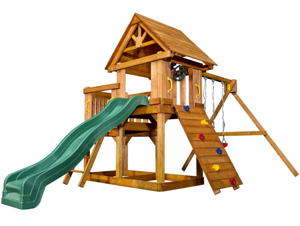 Домик с балконом, качели, лестница, горка и скалодром развивают ловкость малышей, песочница, телескоп, штурвал - активизируют воображение и мышление. Игровые элементы можно изменять и дополнять, заказывая качели и навесное оборудование других модификаций (бинокли, телескопы, рули, штурвалы, телефоны).