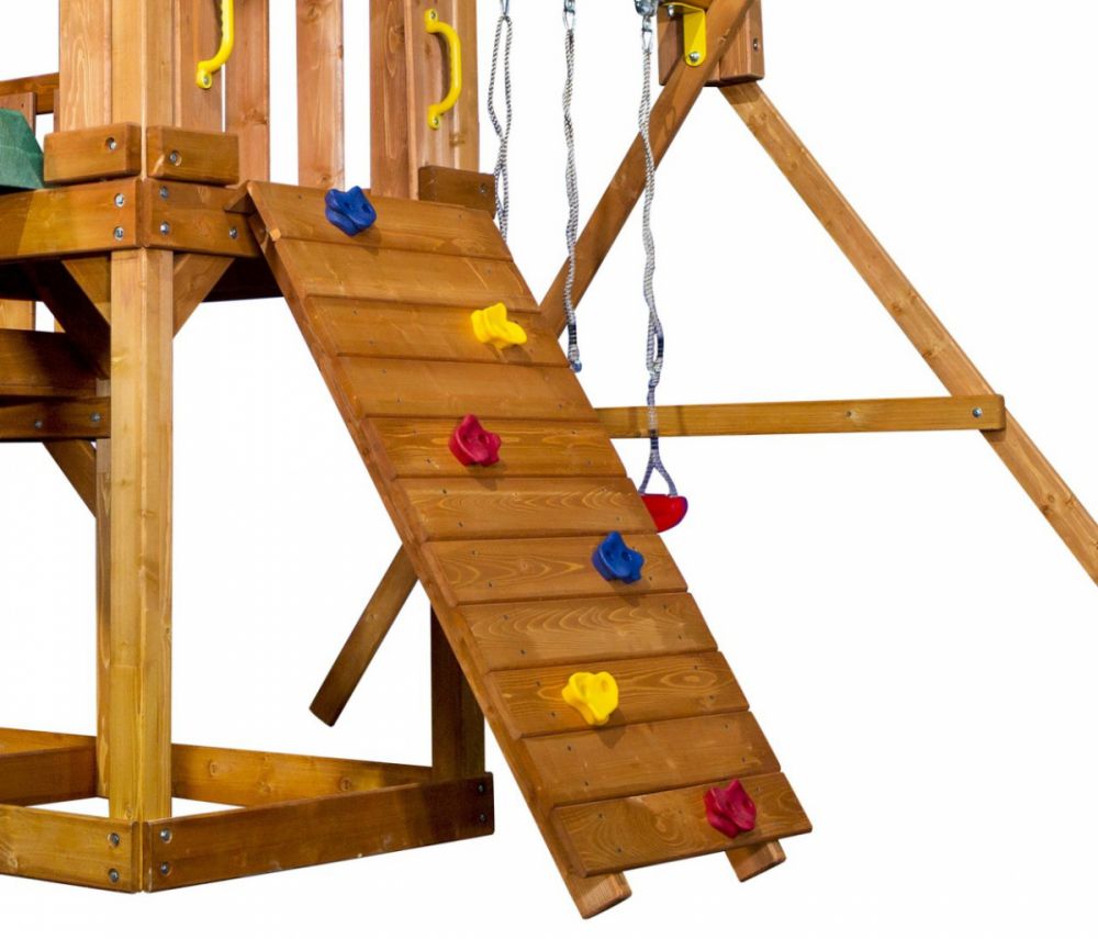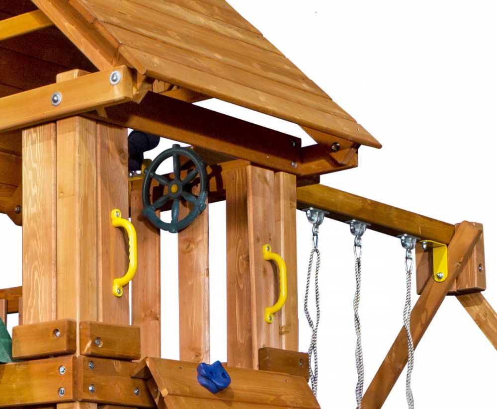 Элементы площадки изготовлены из натуральной древесины и безопасного для здоровья детей пластика. Все детали прошли тщательную обработку и не причинят вреда малышам.