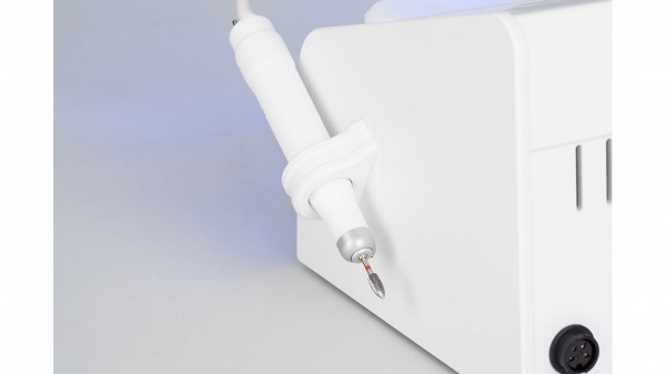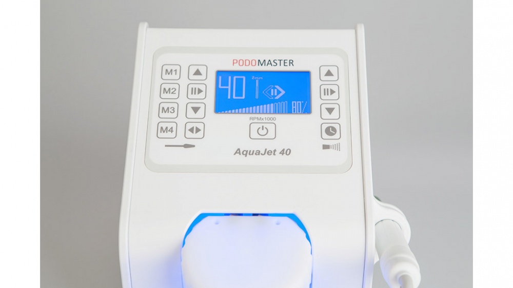 Профессиональный аппарат для педикюра Podomaster AquaJet 40 оснащен мощным спреем. Мощность микромотора в наконечнике модели — 100 Вт, а скорость вращения составляет 40 000 об/мин. Устройство оснащено спреем со специальной легкосъемной емкостью для жидкости. Аппарат имеет большой информативный экран и оборудован ультралегким наконечником с бесщеточным мотором, который можно закрепить в специальном боковом держателе на корпусе.