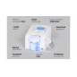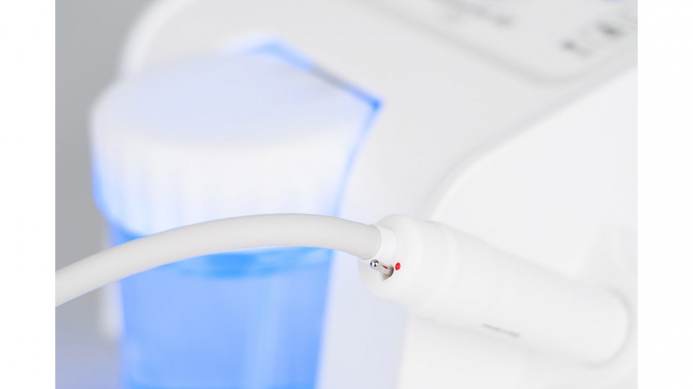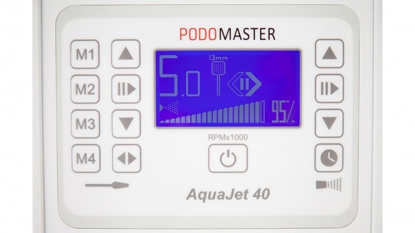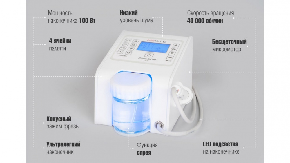 Профессиональный аппарат для педикюра Podomaster AquaJet 40 LED оборудован резервуаром для дистиллята, а в эргономичный наконечник мощностью 100 Вт вмонтирован спрей, который распыляет жидкость в область работы фрезы. Дистиллят или специальная жидкость для спрея охлаждает кожу клиента, снижает коэффициент трения, нейтрализует ногтевую пыль. Ультра лёгкий наконечник с бесщеточным микромотором имеет выключатель, позволяющий останавливать и возобновлять работу аппарата.