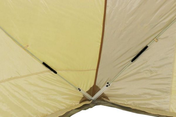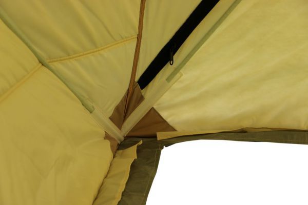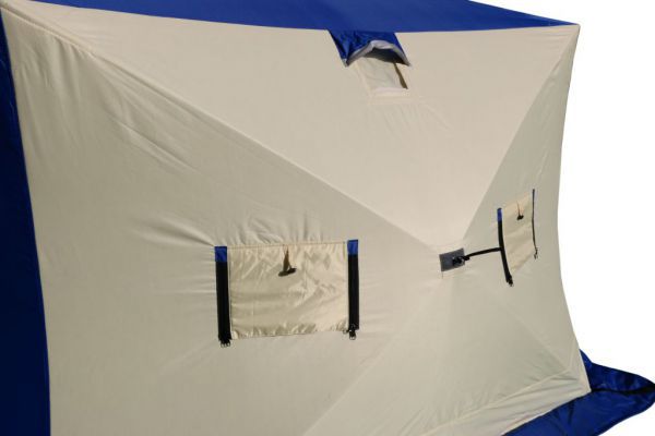 Стены палатки изготовлены из двух слоев водоотталкивающей ткани Oxford 240D с полиуретановым покрытием, между которыми находится толстый слой утеплителя, синтепона плотностью 150г/м2. Светлые ткани, используемые на внутренней части стен, обеспечивают отличную видимость внутри палатки, даже без открытия шторок на окнах. Каркас изготовлен из надежных пластиковых хабов и стеклокомпозитных материалов собственного производства, обладающих повышенной прочностью и жесткостью, благодаря чему палатке не страшен самый сильный ветер.