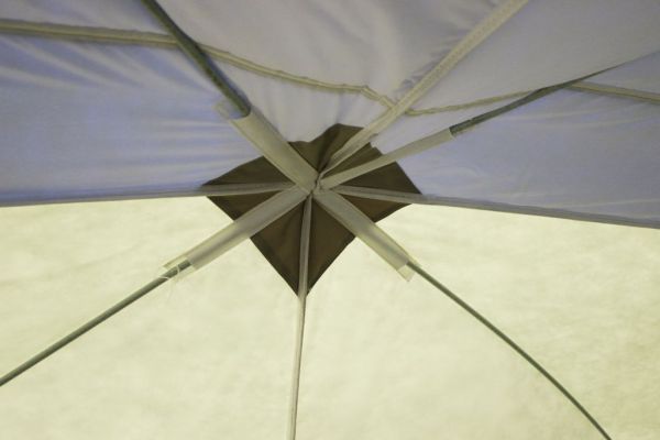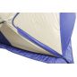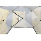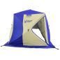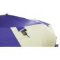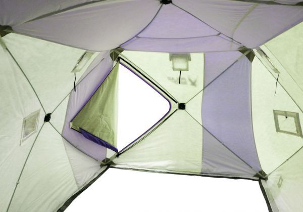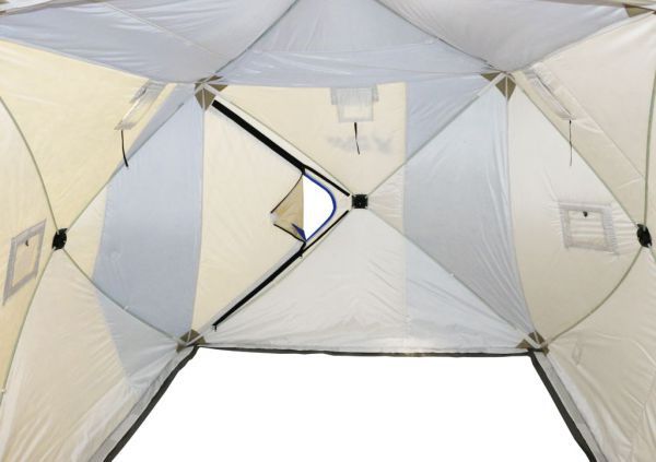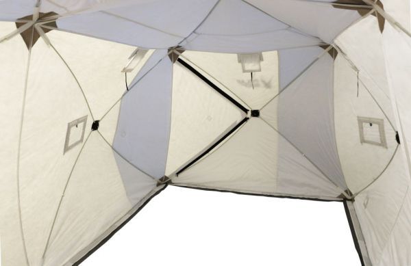Внешний слой тента выполнен из прочной ткани оксфорд бежевого и синего цвета, ткань хорошо пропускает свет, легко чистится с нее легко соскальзывает снег, внутренний слой белого цвета, что делает палатку еще более светлой, позволяя рыбачить без дополнительного освещения в светлое время суток.