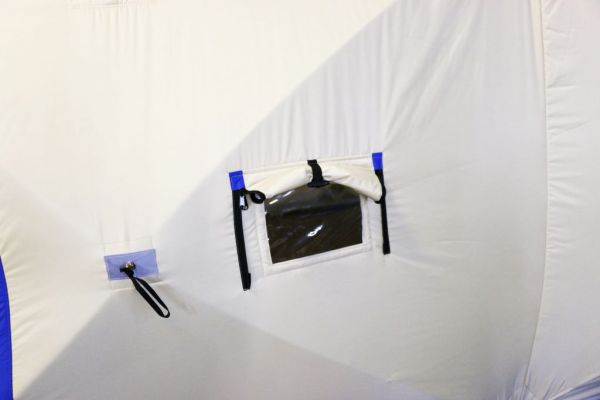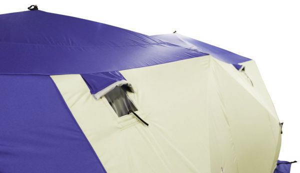 Вентиляционные окна используются для проветривания палатки и вывода газоотводных труб отопителей. Трубу отопителя можно вывести в любое удобное для вас вентиляционное окно, снаружи окна имеют козырьки обшитые термостойкой тканью, изнутри клапана вентиляционных окон имеют специальные привязки, чтобы когда он открыт не касался трубы отопителя. Вентиляционные окна оснащаются съемными прозрачными накладками из морозостойкой пленки с креплением на "липучку", с помощью которых можно регулировать вентиляцию. Их также можно дополнительно заменить на термостойкие накладки под трубы различных отопителей или на накладки из москитной сетки, в случае использования палатки в теплое время года. Дополнительно палатки "Polar bird" оснащены смотровыми окнами, которые также можно укомплектовать москитными сетками.