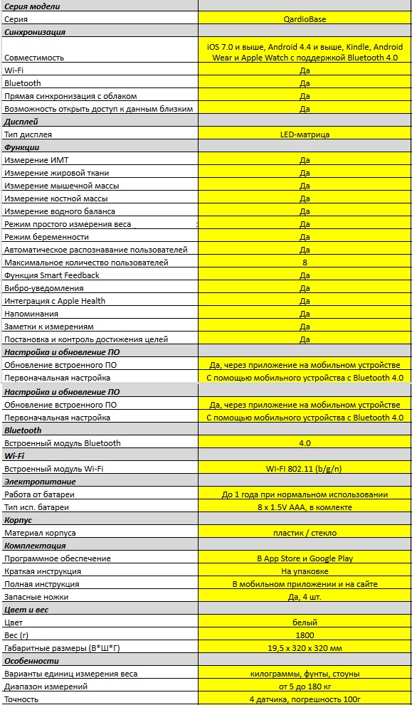QardioBase - это элегантные умные весы, которые измеряют вес, индекс массы тела (ИМТ) и полный набор показателей, определяющих состав тела. Данные измерений отображаются на скрытом дисплее устройства и передаются в защищённое облако по Wi-Fi или напрямую в смартфон по Bluetooth Smart. Затем данные можно проанализировать в локализованном приложении Qardio, наметить цели по весу и составу тела, отслеживать прогресс и делиться данными с семьёй и другими адресатами, например с лечащим врачом.