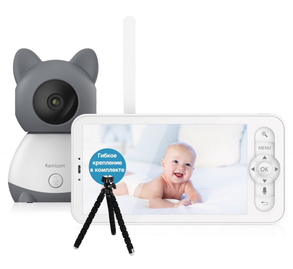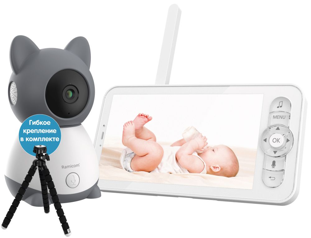 В комплект этой видеоняни уже добавлен гибкий штатив-тренога, с помощью которого камеру можно закрепить почти на любом предмете, например, на элементах мебели. Цифровая видеоняня Ramicom VRC300TR с большим экраном, диагональ которого составляет 12,7 см (пять дюймов) и поворотной камерой, управлять которой можно удаленно. В видеоняне собраны все важные функции, включая датчик движения и возможность подключения к смартфону или планшету для мониторинга из любой точки мира. Видеоняня непрерывно контролирует вашего малыша днём и ночью в режиме 24/7. Может работать в режиме экономии энергии и включаться при обнаружении звука (VOX) или движения вокруг камеры. При этих же событиях поступает пуш-уведомление на смартфоне, если вы подключили видеоняню к домашней сети Wi-Fi. С помощью функции обратной связи вы можете попытаться успокоить малыша на расстоянии, если он расплачется.