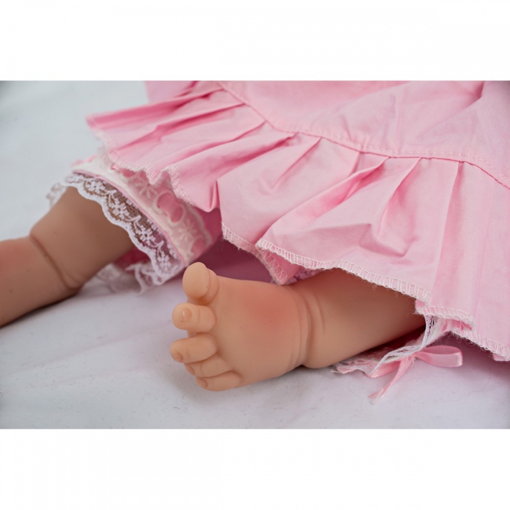 Сашенька имеет приятное на ощупь мягконабивное тело. Голова, руки и ноги сделаны из силикон-винила и покрыты несколькими слоями акриловых красок. Это придает коже натуральный вид. Все складочки прорисованы, на пальцах есть ногти.