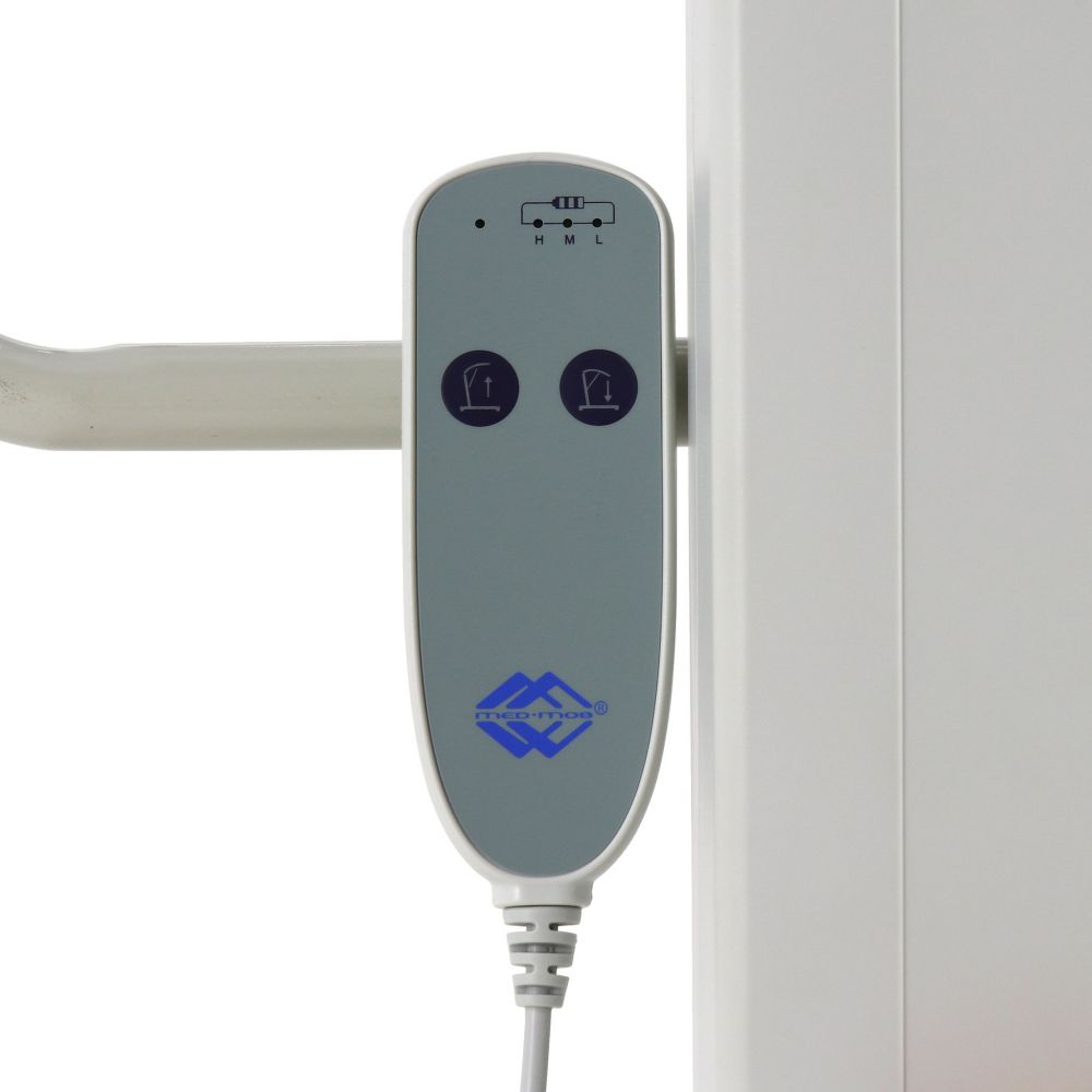 Пульт управления проводной, подключается к блоку управления подъемником, оснащен интуитивно понятными пиктограммами кнопок управления функциями, LED-индикаторами уровня зарядки аккумуляторной батареи и кронштейном для подвешивания на рукояти передвижения. Ширину опоры вы можете регулировать при помощи специальной педали.