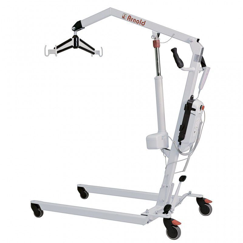 Электрический подъемник Арнольд предназначен для облегчения ухода за пациентами с низкой двигательной активностью. Подъем пользователя осуществляется по средствам кабельного пульта управления, контролирующего работу устройства. Предусмотрена возможность опускания пациента до самого пола. Конструкция подъемника способствует легкому подъезду к заниженной кровати. Безопасность обеспечивается наличием аварийной кнопки отключения питания. Самоориентирующиеся колеса имеют блокировочные фиксаторы.