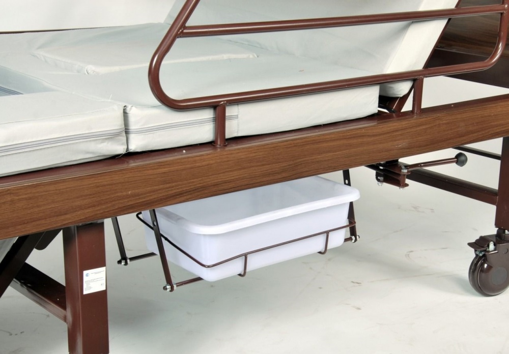 Съемное, выдвижное санитарное устройство позволяет пользователю не вставать с кровати для удовлетворения естественных потребностей. Боковые ограждения можно использовать как опору для столика.