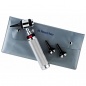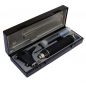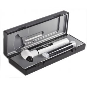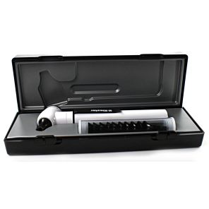 Устройство упаковано в жесткий кейс, но не имеет компактной сумки для удобной транспортировки самого прибора и отдельных комплектующих. Также к недостаткам стоит отнести довольно скудную комплектацию, которая ограничивает функциональные возможности изделия. Практичный набор с прочными металлическими инструментами и вакуумными лампочками на 2,7 В. Сила света регулируется с помощью реостата на ручке батареи типа С. Дополнительно можно заказать ушные воронки диаметром 2 и 5 мм.