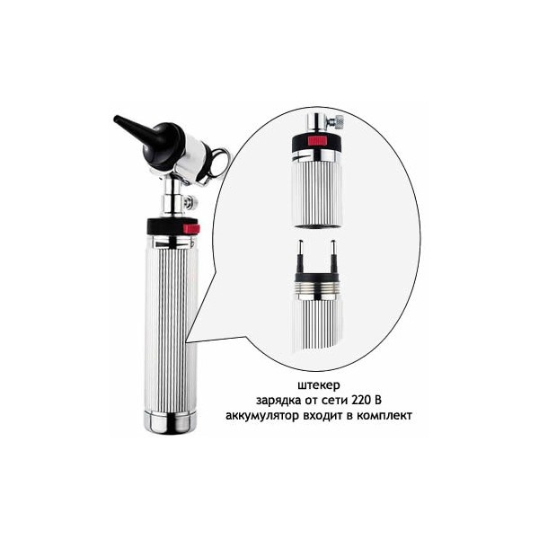 Оптика имеет четырехкратное увеличение, обеспечивающее хорошую видимость. Особенность модели – возможность регулировки яркости освещения с помощью реостата. Все настройки выполняются вручную, прибор не запоминает последние настройки. Диагностический отоскоп используется для просмотра внутреннего слоя органов. Металлический хромированный корпус защищен от внешних раздражителей и коррозии.