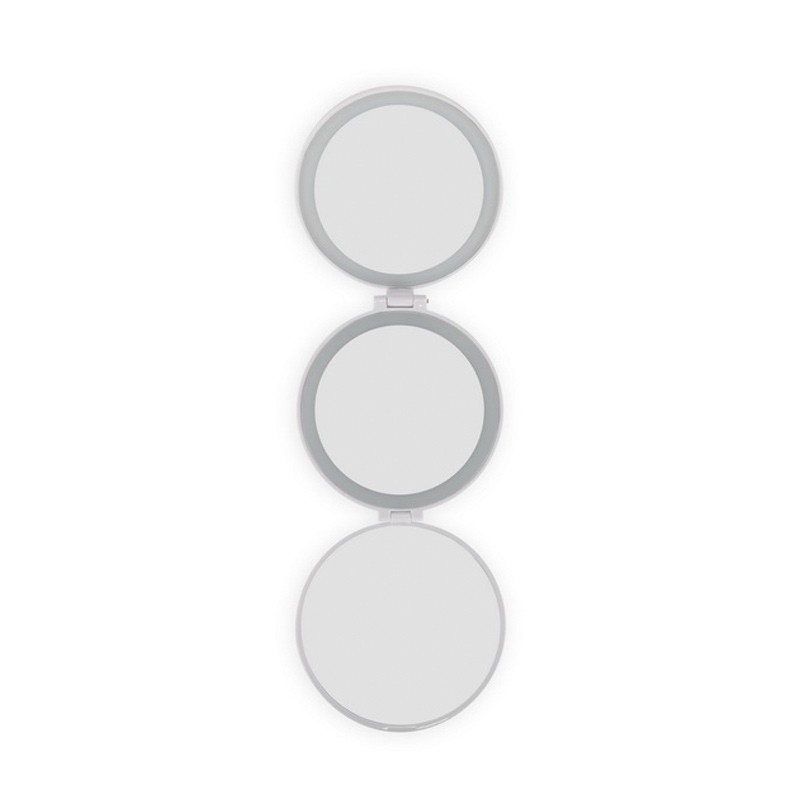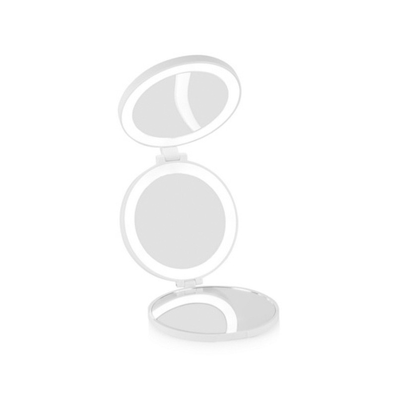 Компактное складное косметическое зеркало c LED подсветкой. Возможность носить в маленькой дамской сумочке. Складной корпус с реальным отражением и двумя вариантами увеличения х5, х10. Питание от 4 батареек типа CR2032 (входят в комплект). При замене элементов питания заменять нужно сразу все 4 батарейки одновременно. Косметическое зеркало MMCI - является универсальным складным зеркалом с тремя отражениями: 1-реальное отражение (без подсветки); 2-отражение с 5-ти кратным увеличением и подсветкой; 3-отражение с 10-ти кратным увеличением и подсветкой.