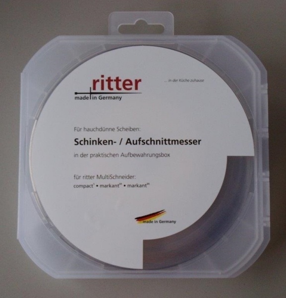 Гладкий нож Ritter 517132 для ломтерезок E 21, pino2, fortis1, fondo1, E16, E18, AES62, AES64, E118. Для очень тонкой нарезки. Ножи специально закалены по режущей кромке, что улучшает качество нарезки и, в то же время, гарантирует длительное сохранение остроты заточки ножа. Нож сделан из нержавеющей стали.