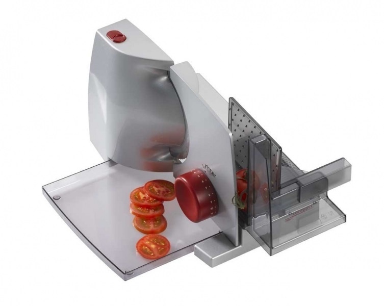 Ritter Compact 1 – удобный бытовой слайсер для нарезки сыра, колбасы, овощей, хлеба. Толщину ломтика можно плавно регулировать (до 20 мм). Для защиты пальцев рук в комплект включен специальный толкатель продуктов. В качестве подарка вместе с прибором поставляется изящный поднос для нарезанных продуктов.
