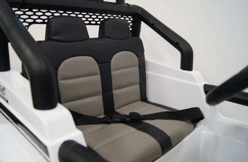 Салон — комфортный и вместительный. Материал корпуса - перламутровый пластик. Рассчитан на 2-х детей. Кресла кожаные мягкие. Безопасность обеспечивает пятиточечный ремень безопасности. Двери не открываются. Поднимается дверца багажника,где запаска (можно положить маленькие вещички).