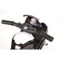 Сиденье кожаное, большие, широкие и комфортные подножки, тонированное ветровое стекло. Ребенок спокойно может забраться на мотобайк. Катание происходит от давления на педаль. Передние фары начинают светиться во время нажатия на педаль. Имеются и звуковые эффекты, для них нужны две батарейки AAA.