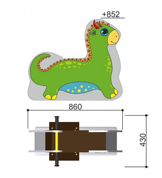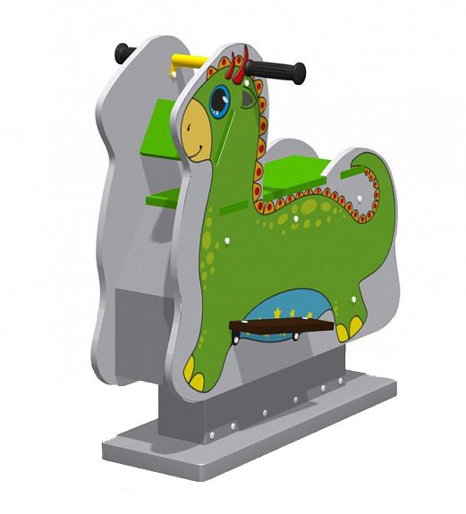 Качалка для тематических игр, предназначена для детей в возрасте от 2 лет. На фигурную вставку при помощи УФ-печати нанесено изображение в тематике «диназавр». Конструкция качалки предоставляет возможность качаться пользователю по оси «вперед-назад». Изделие приходит в движение за счет переноса веса ребенка - совершения раскачивающих движений «назад-вперед». Платформа обеспечивает плавное легкое качание, без ударов и усилий.