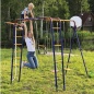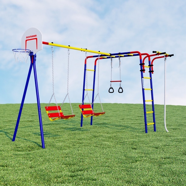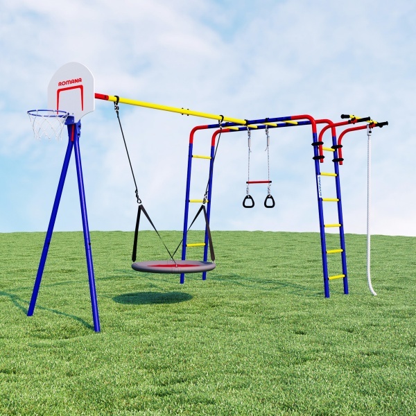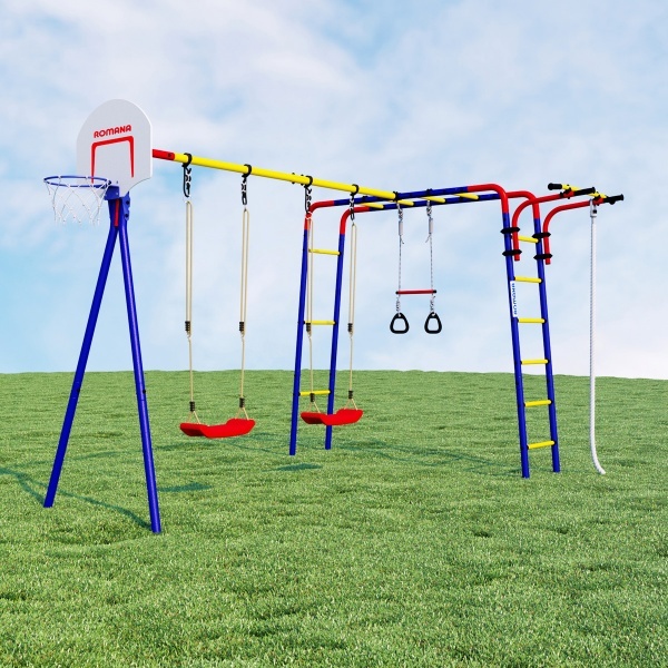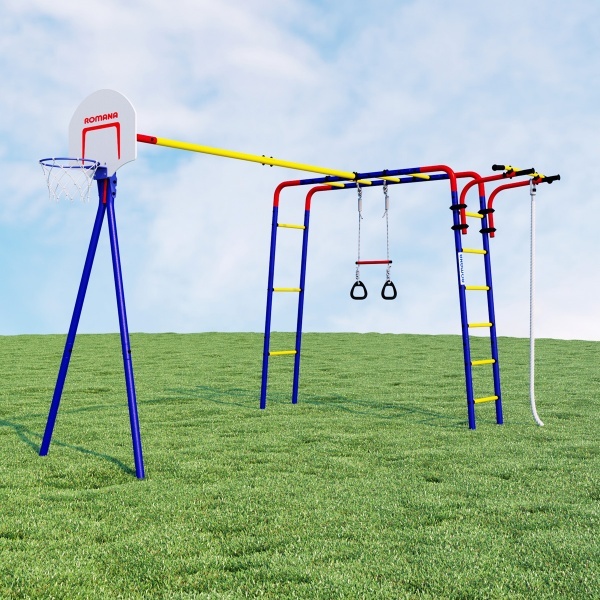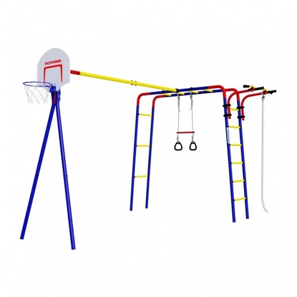 Спортивный детский комплекс Romana Акробат представляет собой многофункциональное уличное оборудование, которое предназначено для спорта и активного отдыха. Он подходит для дачи или загородного дома, а также идеален для оснащения детских площадок в многоквартирных домах и детских учреждениях. Модель оснащена большим количеством элементов – это рукоход, турник, канат, кольца и трапеция, а также щит для игры в баскетбол и другое дополнительное навесное оборудование. Максимальная нагрузка на опоры комплекса не должна превышать 100 кг. Основным материалом изготовления выступает металл, который не теряет своих прочностных характеристик на протяжении десятилетий. Против губительного воздействия влаги дополнительно используется антикоррозийное покрытие. Этот спортивный комплекс станет любимым местом для занятий спортом и увлекательного активного отдыха, подарив детям много радости и новых открытий!