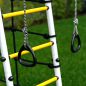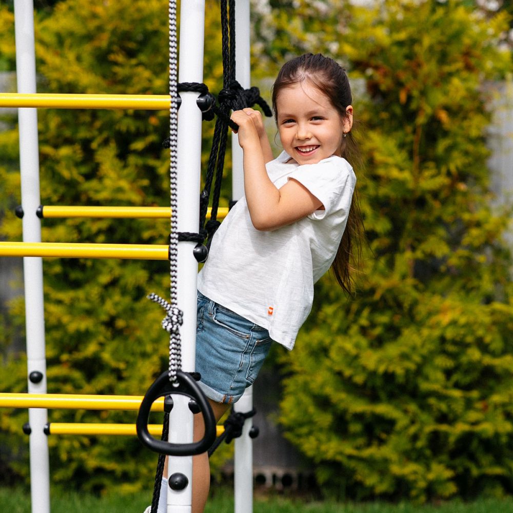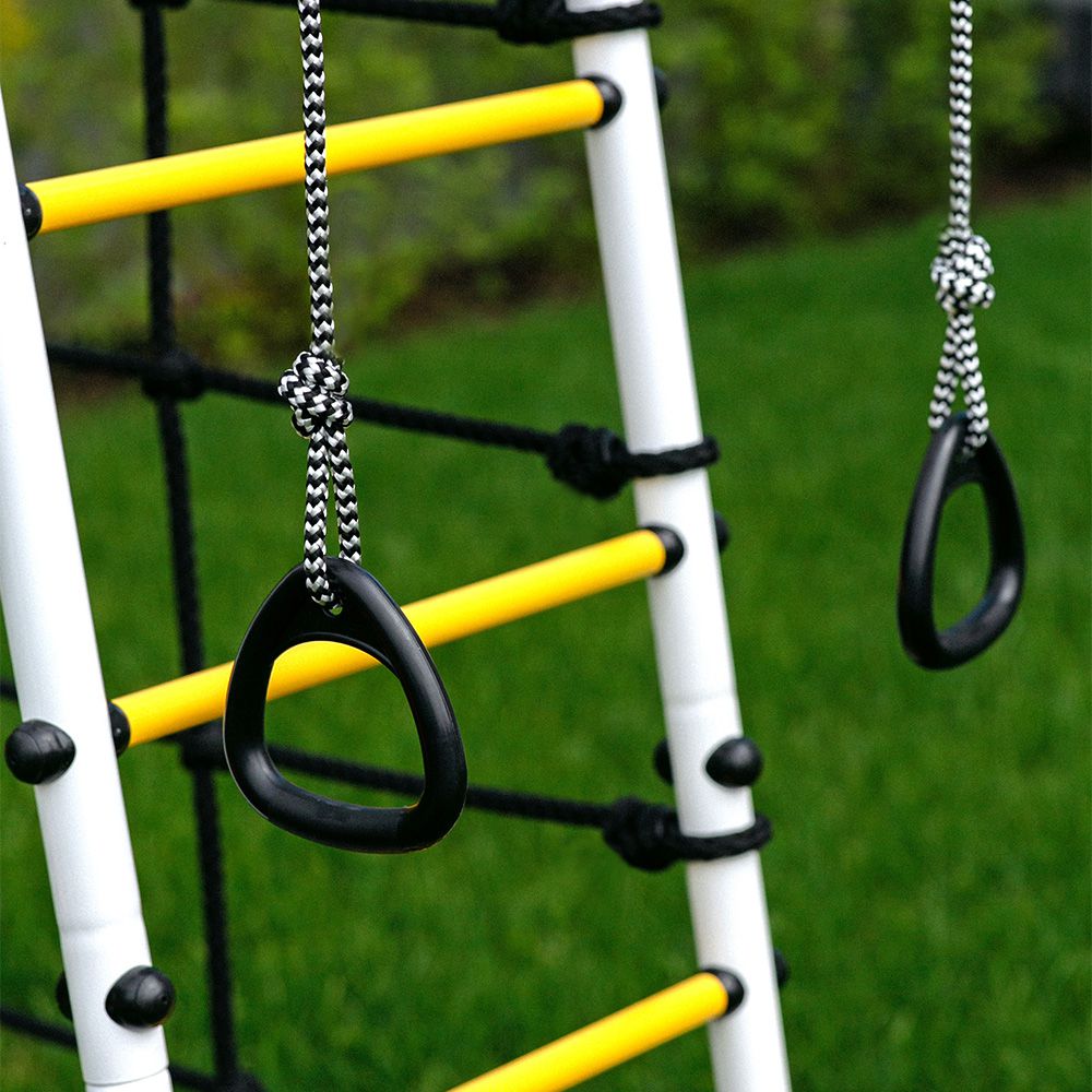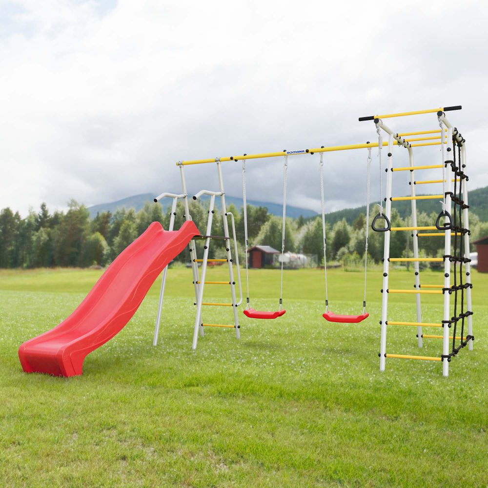 В комплект входят - горка, кольца, сетка лаза, гимнастическая лестница, рукоход и турник. Дополнить комплекс можно одинарными или парными качелями, а также подвесным диваном.