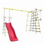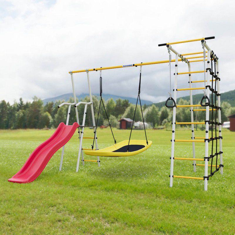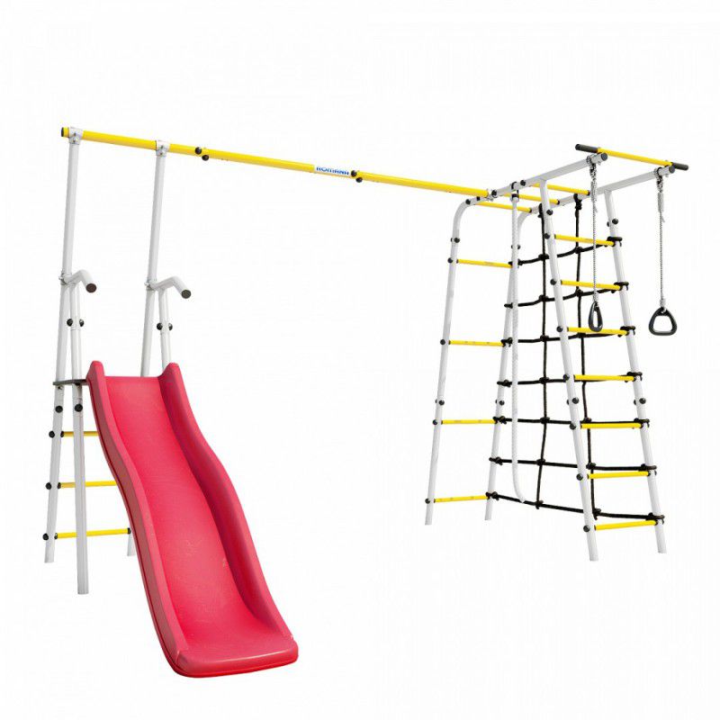 В дачном спортивном комплексе ROMANA «Богатырь Плюс 2» предусмотрено много возможностей для спортивных занятий маленьких богатырей. Здесь и лестница, и турник, и брусья, и гимнастические кольца, а также небольшой канатный лаз из шнура повышенной прочности. Вторая часть комплекса — это удобная и безопасная горка. Части соединены надежной металлической перекладиной, которая испытывается нагрузкой в 200 кг.