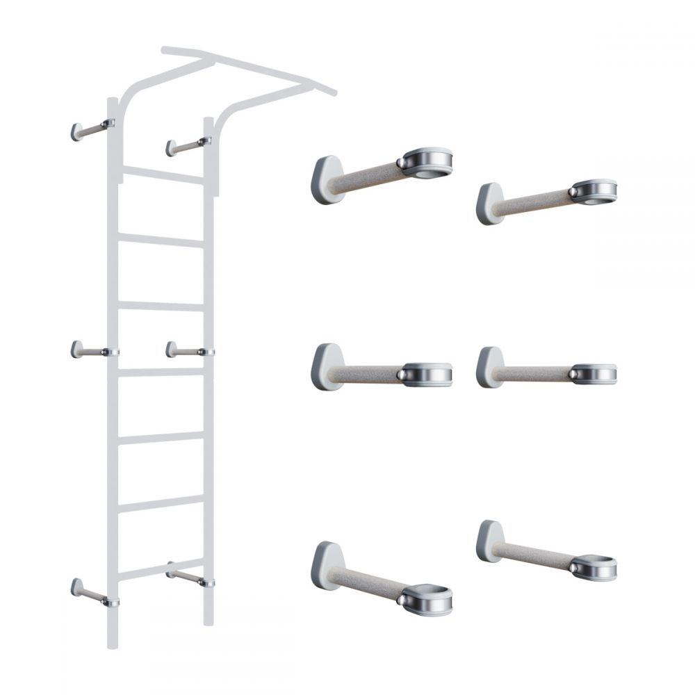 Romana Кронштейны настенные Dop11 (комплект 6 шт.) предназначены для крепления лестницы спортивного комплекса к стене. С их помощью можно найти оптимальные точки фиксации, когда нужно избежать попадания в полость стены, проводку или какой-либо элемент декора, а также закрепить лестницу в углу, фиксируя ее на разных стенах.
