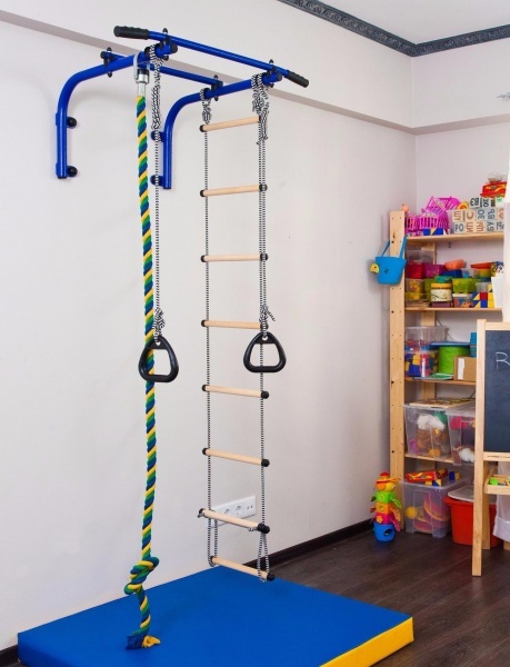 Турник крепится к стене. Металлические части конструкции имеют защитное покрытие, исключающее образование коррозии.