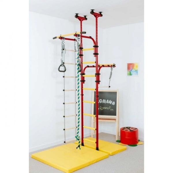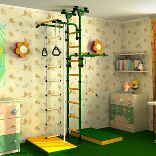 Металлический спортивный комплекс "Олимпиец-1" с обливными пластиковыми массажными перекладинами. Шведская стенка с крепление в распор (между полом и потолком) имеет регулируемую раму турника, которая позволяет комплексу "расти" вместе с ребенком и делает шведскую стенку подходящей всем возрастам.