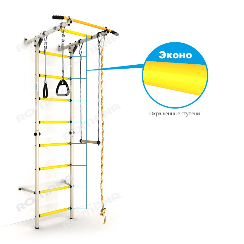 Шведская стенка Карусель S1 представлена несколькими гимнастическими снарядами. В конструкции лестницы использованы окрашенные ступени — эконо, без дополнительного покрытия.