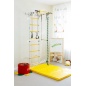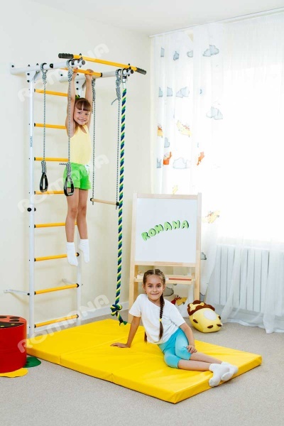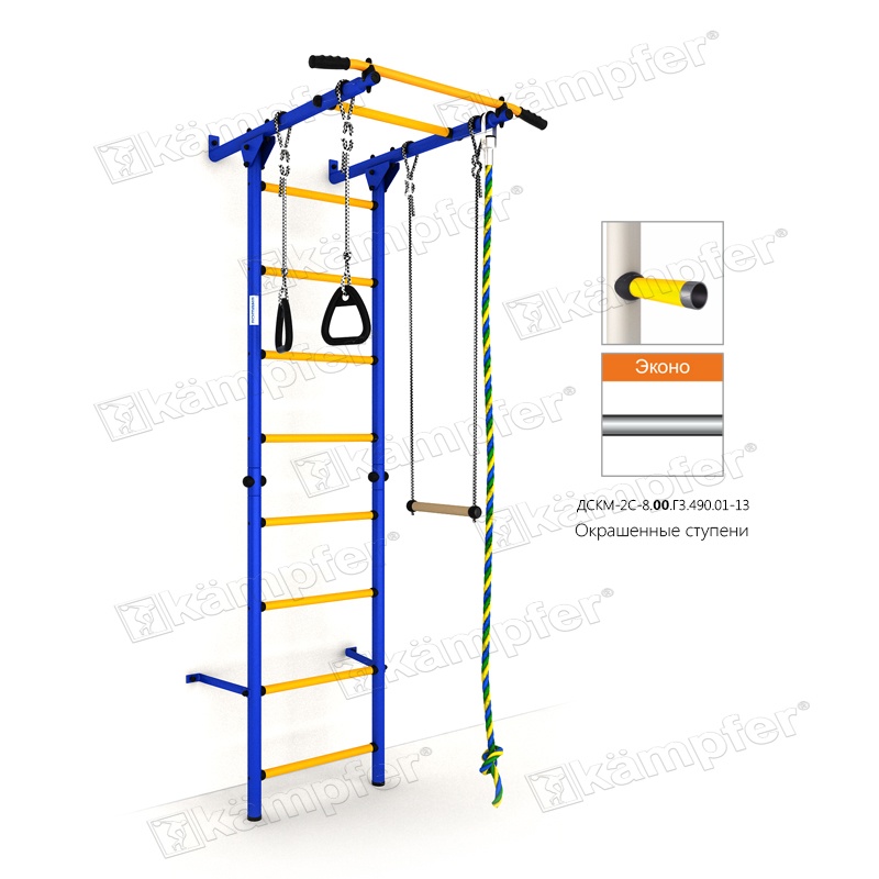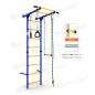 Спортивный комплекс представлен гимнастической лестницей с окрашенными ступенями, турником, канатом, трапецией и подвесными кольцами. Крепление стенки производится к опорной стене.
