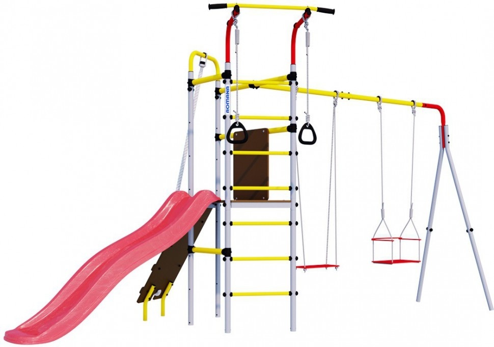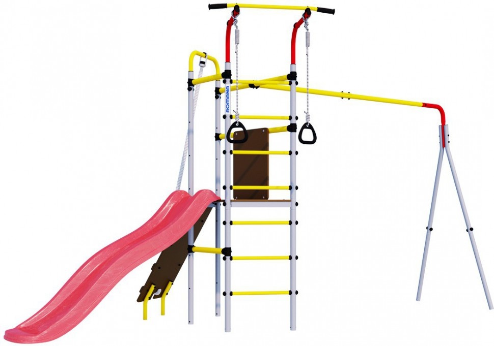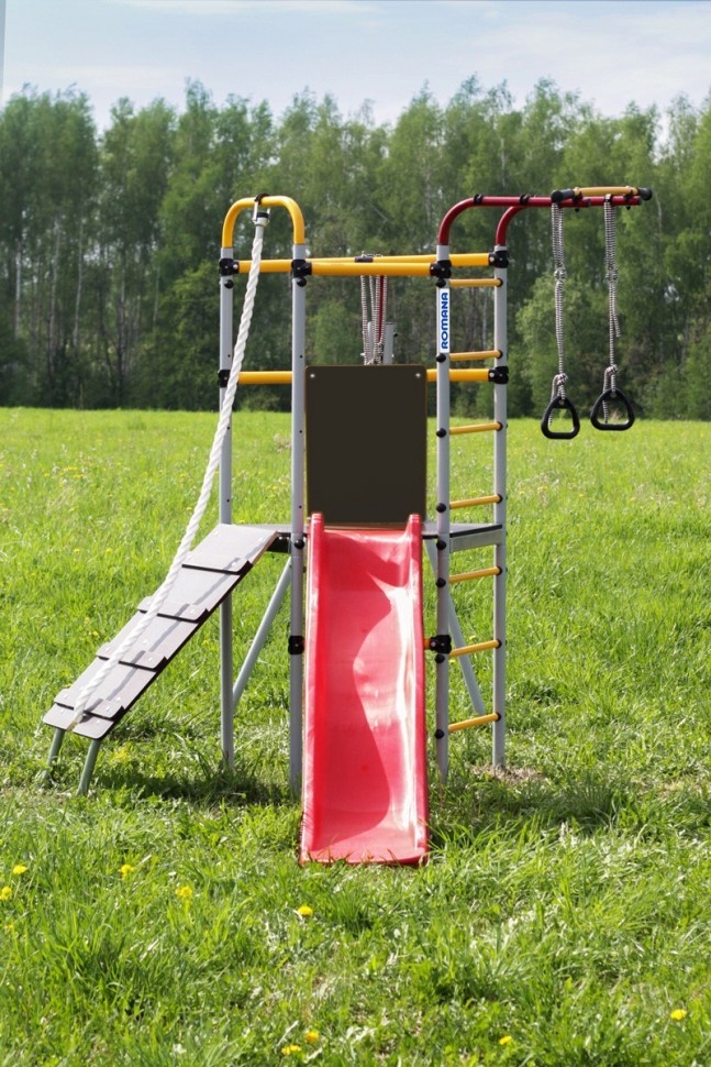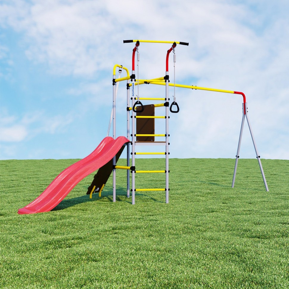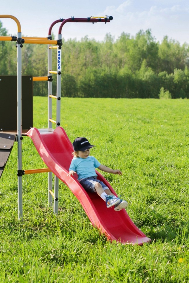 Уличный спортивный комплекс Romana Островок Плюс разработан в новом дизайне и предусматривает расширенную комплектацию. Горка, наклонный лаз, шведская стенка, турник и гимнастические кольца – здесь предусматривается все необходимое для того, чтобы ребенок получал максимум пользы и радости от пребывания на свежем воздухе. Поэтому такой спортивный комплекс часто устанавливают во дворах домов, на дачах, в школах и детских садах. Благодаря использованию качественного сырья навесное оборудование устойчиво к негативному атмосферному воздействию – оно безукоризненно прослужит на протяжении десятилетий. Основным материалом изготовления был выбран металл, поэтому детский комплекс обладает прочностью, устойчивостью и высокой надежностью. Регулярные занятия на таком уличном оборудовании благотворно сказываются на здоровье детей и их физическом развитии, позволяют тренировать выносливость, развивать силу и ловкость.