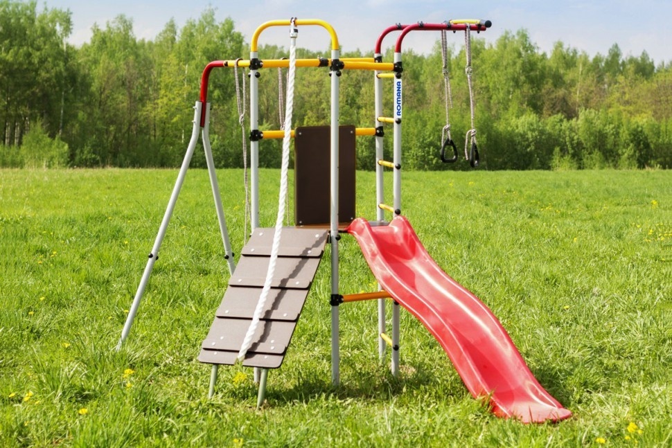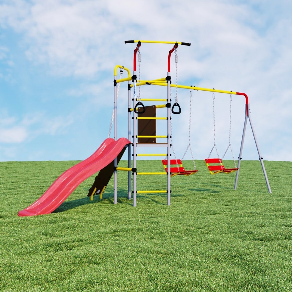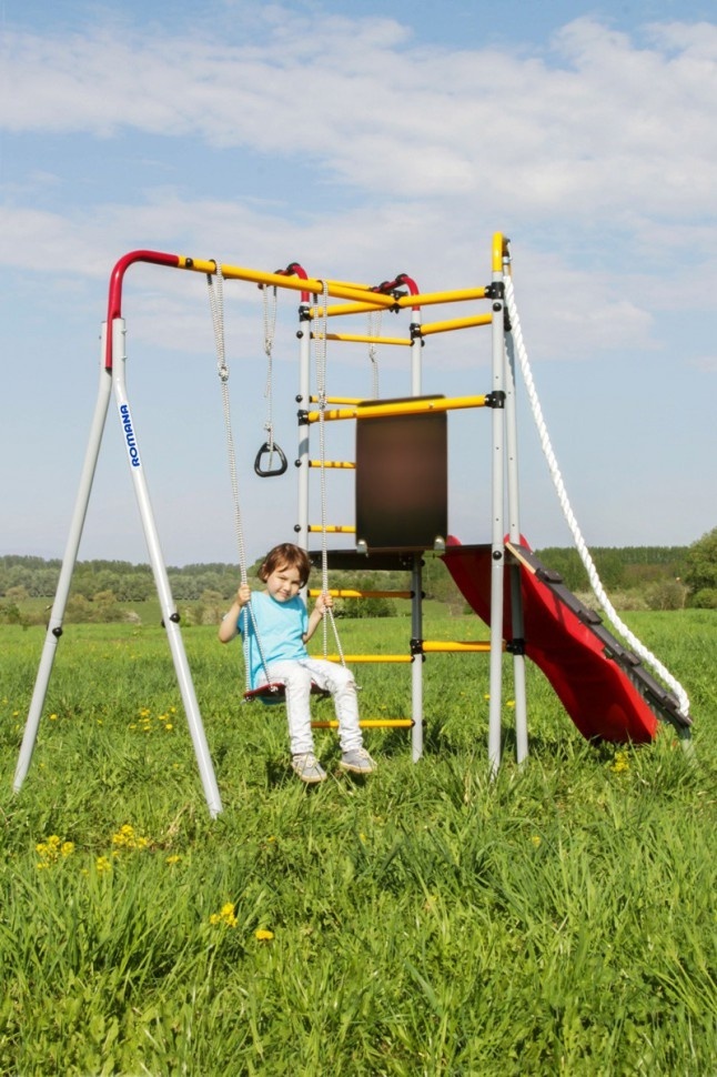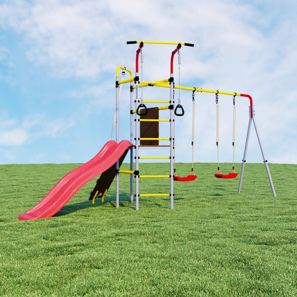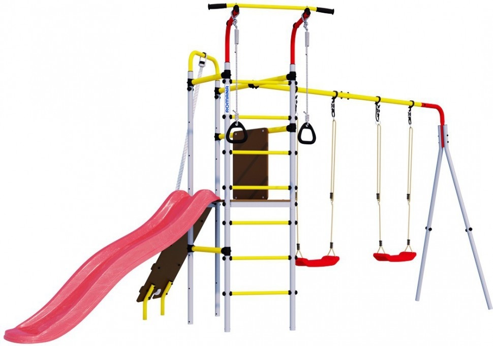 Уличный спортивный комплекс Romana Островок Плюс разработан в новом дизайне и предусматривает расширенную комплектацию. Горка, наклонный лаз, шведская стенка, турник и гимнастические кольца – здесь предусматривается все необходимое для того, чтобы ребенок получал максимум пользы и радости от пребывания на свежем воздухе. Поэтому такой спортивный комплекс часто устанавливают во дворах домов, на дачах, в школах и детских садах. Благодаря использованию качественного сырья навесное оборудование устойчиво к негативному атмосферному воздействию – оно безукоризненно прослужит на протяжении десятилетий. Основным материалом изготовления был выбран металл, поэтому детский комплекс обладает прочностью, устойчивостью и высокой надежностью. Регулярные занятия на таком уличном оборудовании благотворно сказываются на здоровье детей и их физическом развитии, позволяют тренировать выносливость, развивать силу и ловкость.