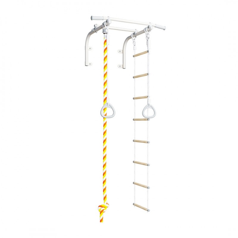 Далеко не всегда есть возможность разместить в помещении полноценную шведскую стенку. Но если очень хочется заниматься спортом не выходя из дома, разместить в своей комнате различное спортивное оборудование, прекрасным вариантом может стать турник настенный. Турник крепится непосредственно на стену в 4-х точках. Крепежные элементы закрываются заглушками, что обеспечивает защиту спортсмена от случайных повреждений во время занятий. Такое крепление позволяет удерживать значительный вес, максимальная нагрузка на турник может достигать 100 кг. В комплект оборудования входит сама перекладина-турник, канат, веревочная лестница и гимнастические кольца. Навесное оборудование может крепиться в наиболее удобных для этого местах, в том числе на стоевые или на дополнительную перекладину, которая придает жесткость всей конструкции.