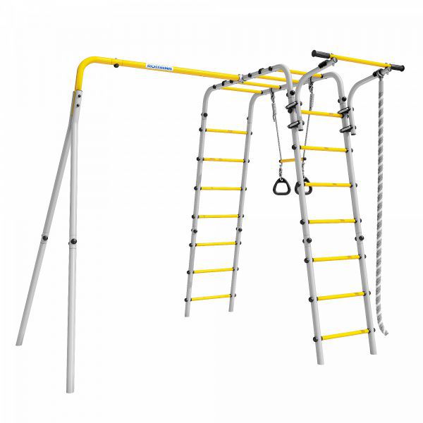 Подвижная конструкция турника позволяет установить его на удобной для ребенка высоте. Дополнить комплекс можно сеткой лазом, баскетбольным щитом и качелями разных видов. Множество игровых элементов способствует всестороннему физическому и интеллектуальному развитию ребенка.