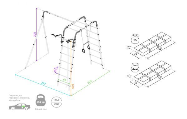 Безопасные занятия для детей и взрослых гарантирует конструкция комплекса из прочной стали. Допустимая нагрузка на комплекс с рукоходом и турником 100кг. Детское навесное оборудование (канат и кольца) выдерживают до 50 кг.