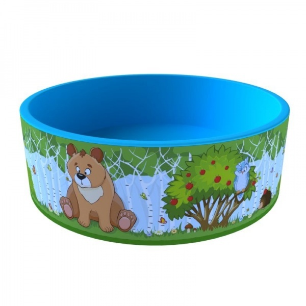Сухой бассейн «Зверята» синего цвета, в дизайне забавные зверушки и деревья. Это достаточно компактный элемент интерьера, он не займет много места в помещении. Сухие бассейны безопасны, у них нет твердых или острых частей. Они хорошо очищаются от грязи и влаги.