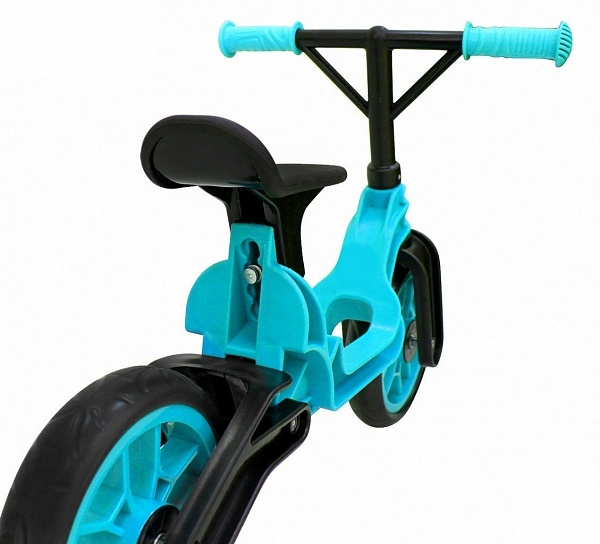 Конструкция изготовлена из усиленного пластика, поэтому имеет легкий вес. Мягкие полиуретановые колеса обеспечивают плавную и бесшумную езду на дороге с любым покрытием, не оставляют царапин на полу. Руль оснащен прорезиненными ручками с ограничителями. Набрав скорость, можно поставить ноги на раму, удерживая равновесие. У беговела заднее колесо складывается под раму, что позволит сэкономить место во время транспортировки и хранения.