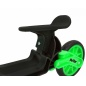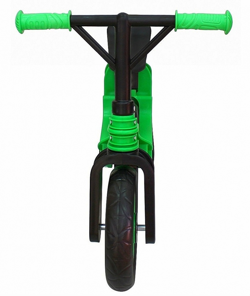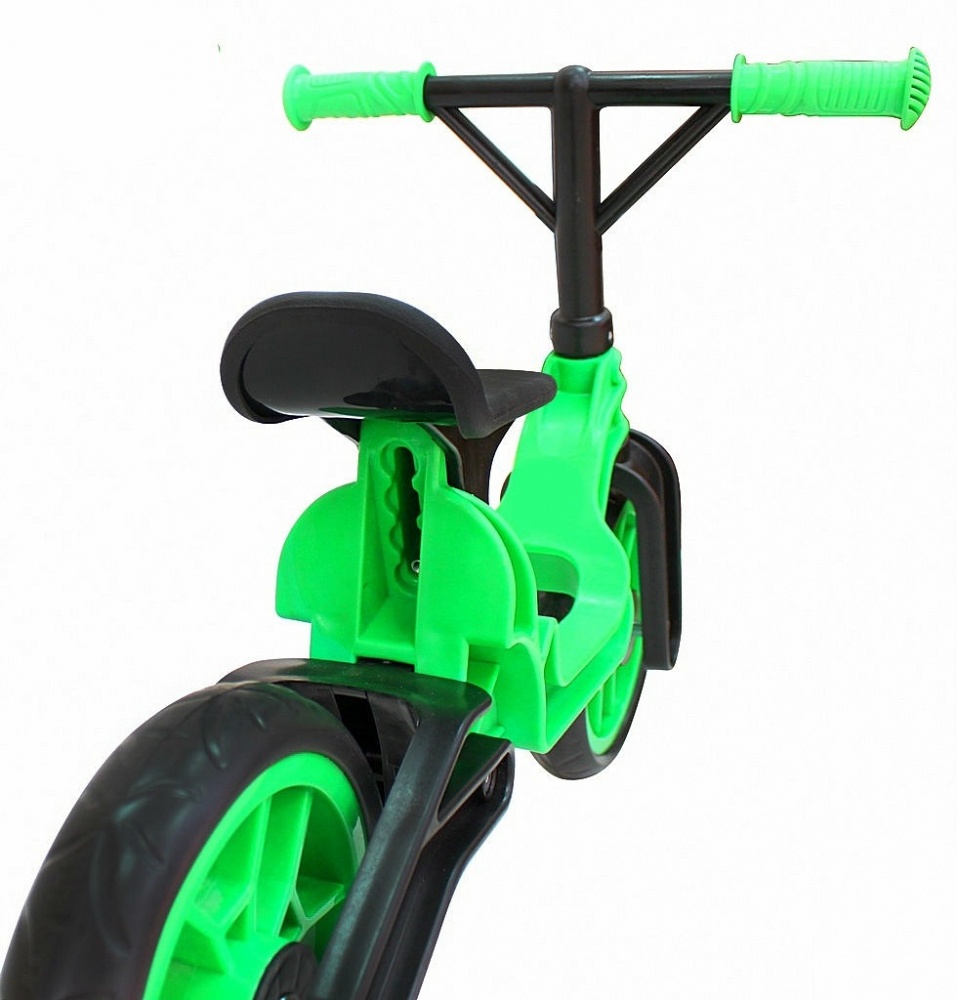 Конструкция изготовлена из усиленного пластика, поэтому имеет легкий вес. Мягкие полиуретановые колеса обеспечивают плавную и бесшумную езду на дороге с любым покрытием, не оставляют царапин на полу. Руль оснащен прорезиненными ручками с ограничителями. Набрав скорость, можно поставить ноги на раму, удерживая равновесие. У беговела заднее колесо складывается под раму, что позволит сэкономить место во время транспортировки и хранения.