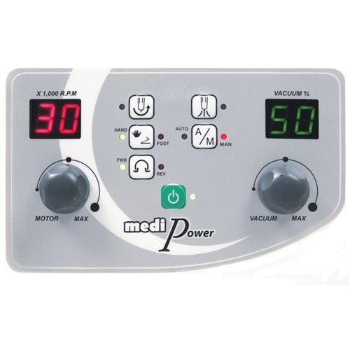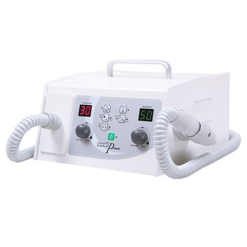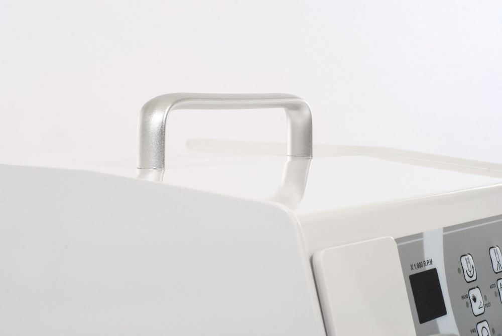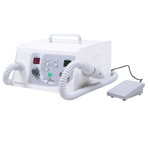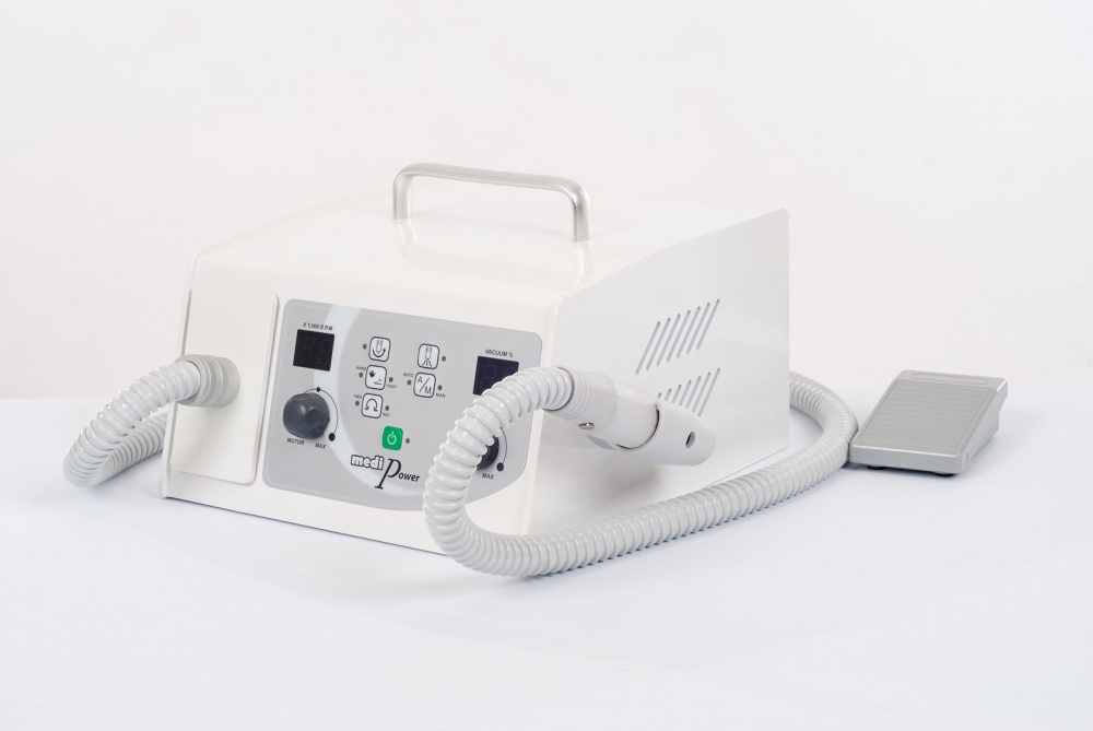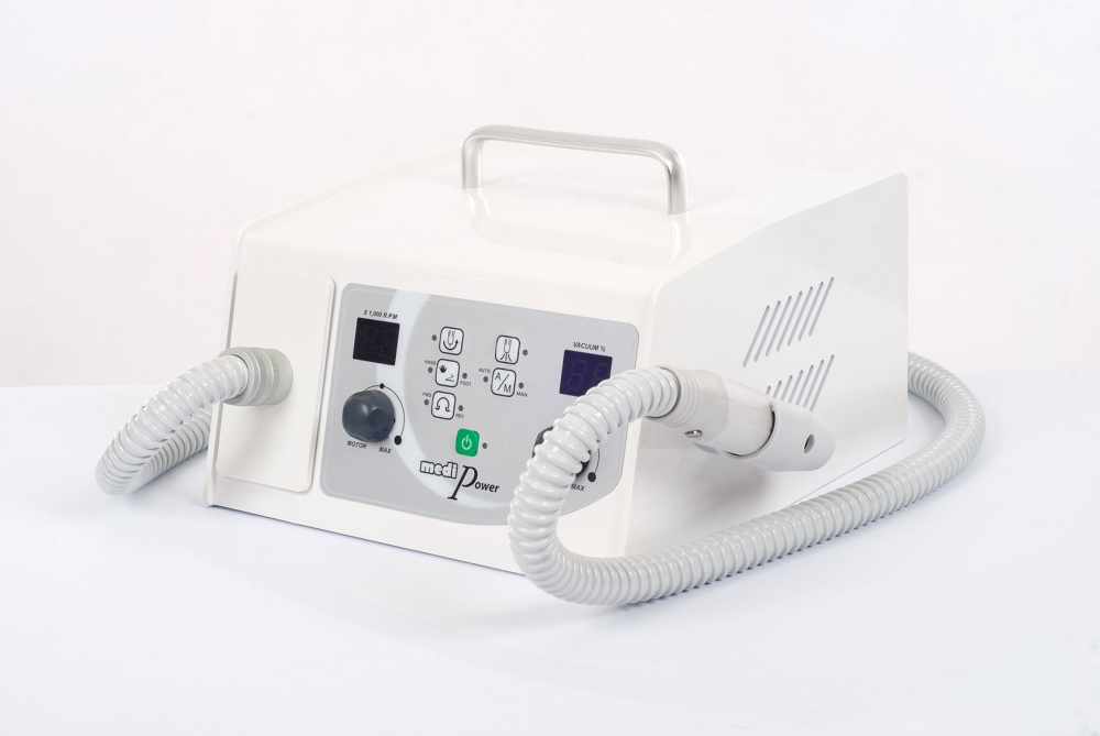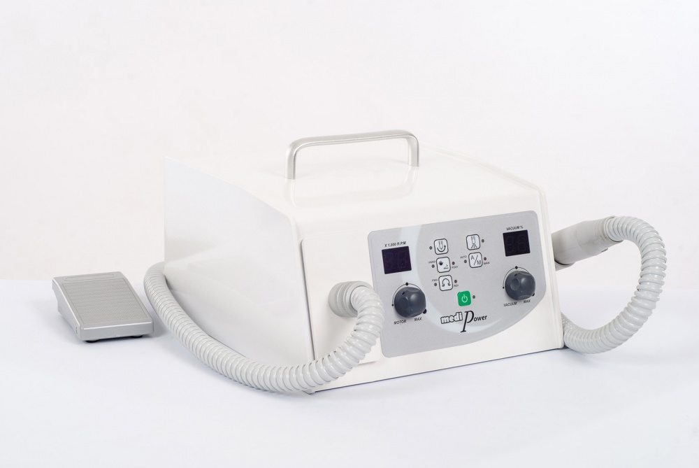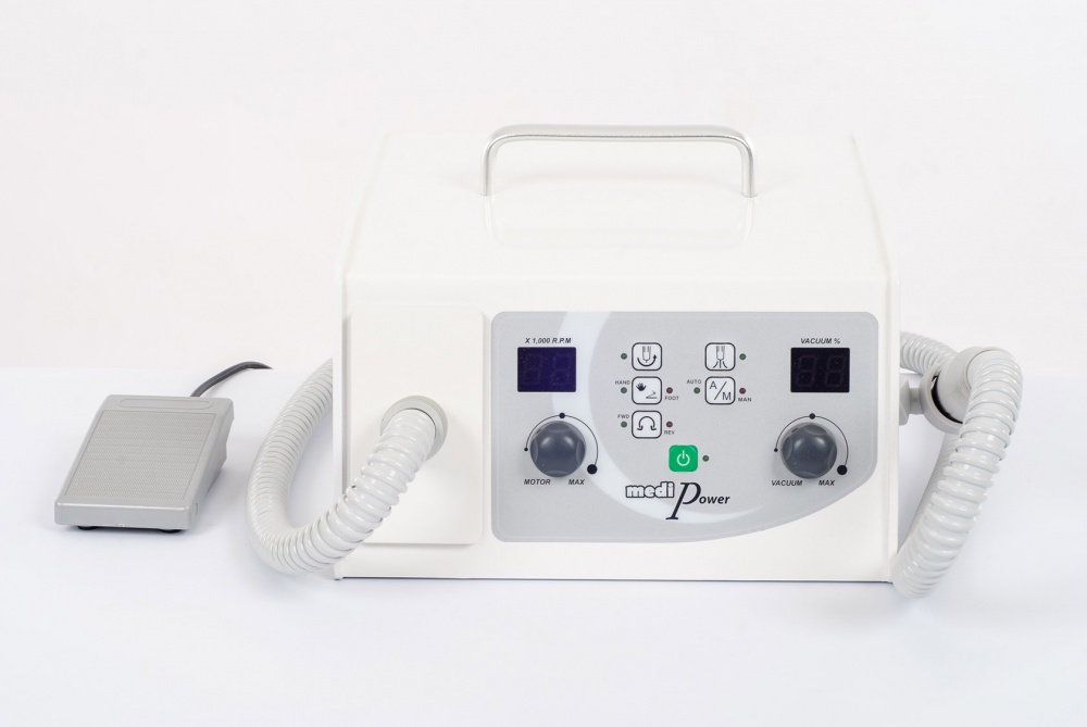 Для профессионального педикюра в салонных или домашних условиях используется аппарат Saeshin MediPower. Данная модель пользуется популярностью благодаря наличию пылесоса, что позволяет повысить эффективность и обеспечить гигиеничность проводимых процедур. Мешок для пыли снимается без затруднений, а на цифровом дисплее отображаются все режимы работы. На боковом держателе закрепляется наконечник из специального пластика. Кнопка старта и окончания работы расположена на ручке аппарата. Имеется также ручка в верхней части корпуса, которая облегчает переноску и транспортировку прибора, что актуально в случае выезда к клиентам на дом.