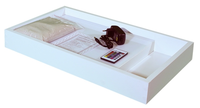 Увлекательнейшая игрушка , наглядное пособие для изучения и повествования всего чего угодно и наконец просто замечательное средство для общения взрослых и детей! Рисование песком позволяет хорошо развивать мелкую моторику, со временем работает лучше память, развивается координация, улучшается работа мозга. Есть возможность одновременно тренировать и развивать кисти обеих рук. Рисовать песком очень просто. Любая линия становится сразу же отчетливо видна, любой контур тут же легко подправить, как бы играя, ничего не забирая у малыша (как с карандашом) и сказать, что это он сам нарисовал. Такая легкость придает уверенность в себе малышу, что позволяет ему полностью раскрыться в рисунке, воплощая все новые и новые идеи. Таким образом, рисование песком развивает фантазию и эстетический вкус. Присоедините блок питания к планшету и включите его в розетку. Управляйте подсветкой с помощью пульта. У планшета есть несколько режимов работы - яркие и бледные цвета, мерцание, плавные переливы.